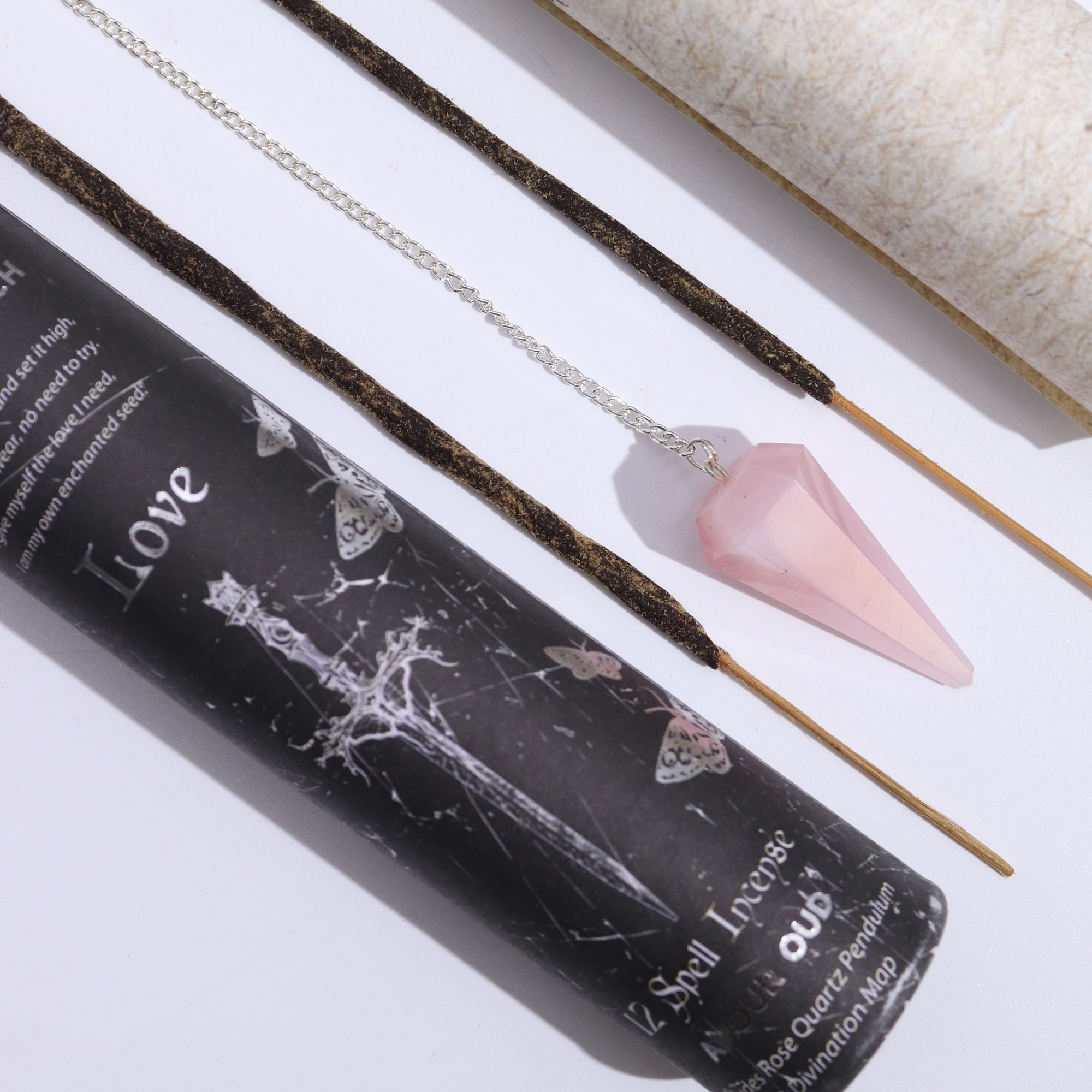 Each tube holds approximately twelve incense sticks, a Rose Quartz pendulum and a divination map, all presented in high-end packaging that feels special from the moment it is picked up.