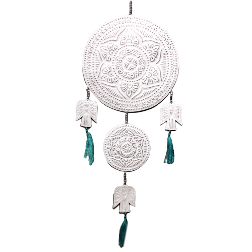 Beaten and hand painted aluminium has been used for generations to make offering boxes for use in temples. Now this same technique is used to make these enchanting mobiles.