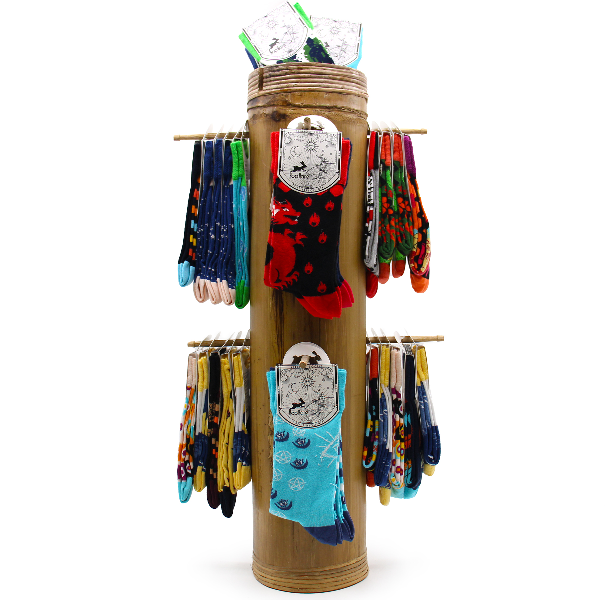 It can be easily placed on a shelf or displayed on a table, providing a unique and eye-catching addition to your shop. The Bamboo Sock Display is easy to assemble and disassemble, making it perfect for those who are always on the move. Its lightweight and sturdy design allow for easy transportation and storage, making it a must-have for market stalls.