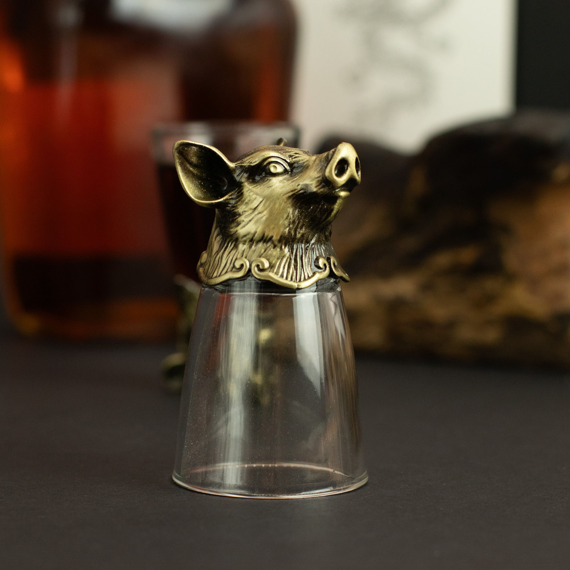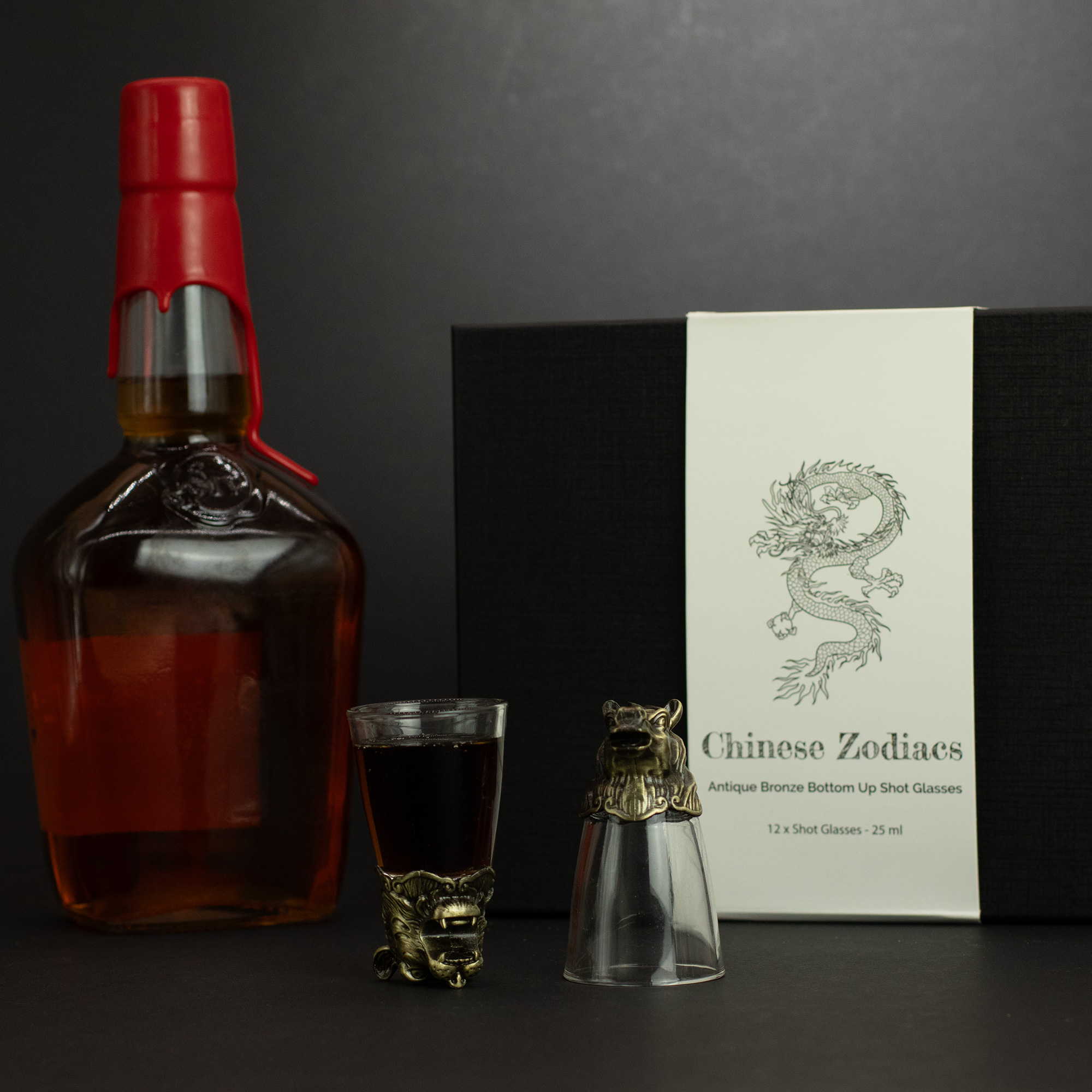 Each 25ml shot glass features a brass base shaped into one of the twelve zodiac animals — from dragon to rabbit, tiger, and horse — all finished with fine sculptural detail that stands out beautifully when the glass is turned upside down.