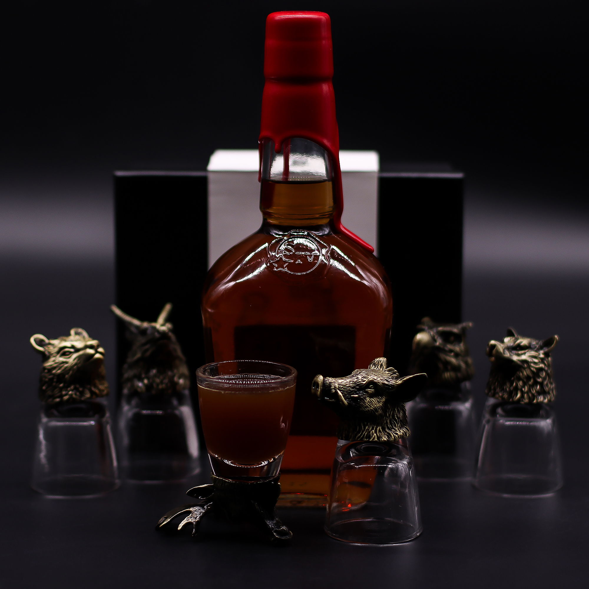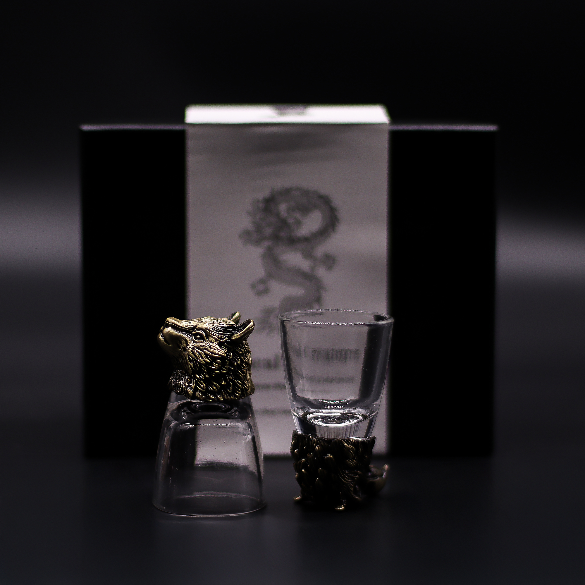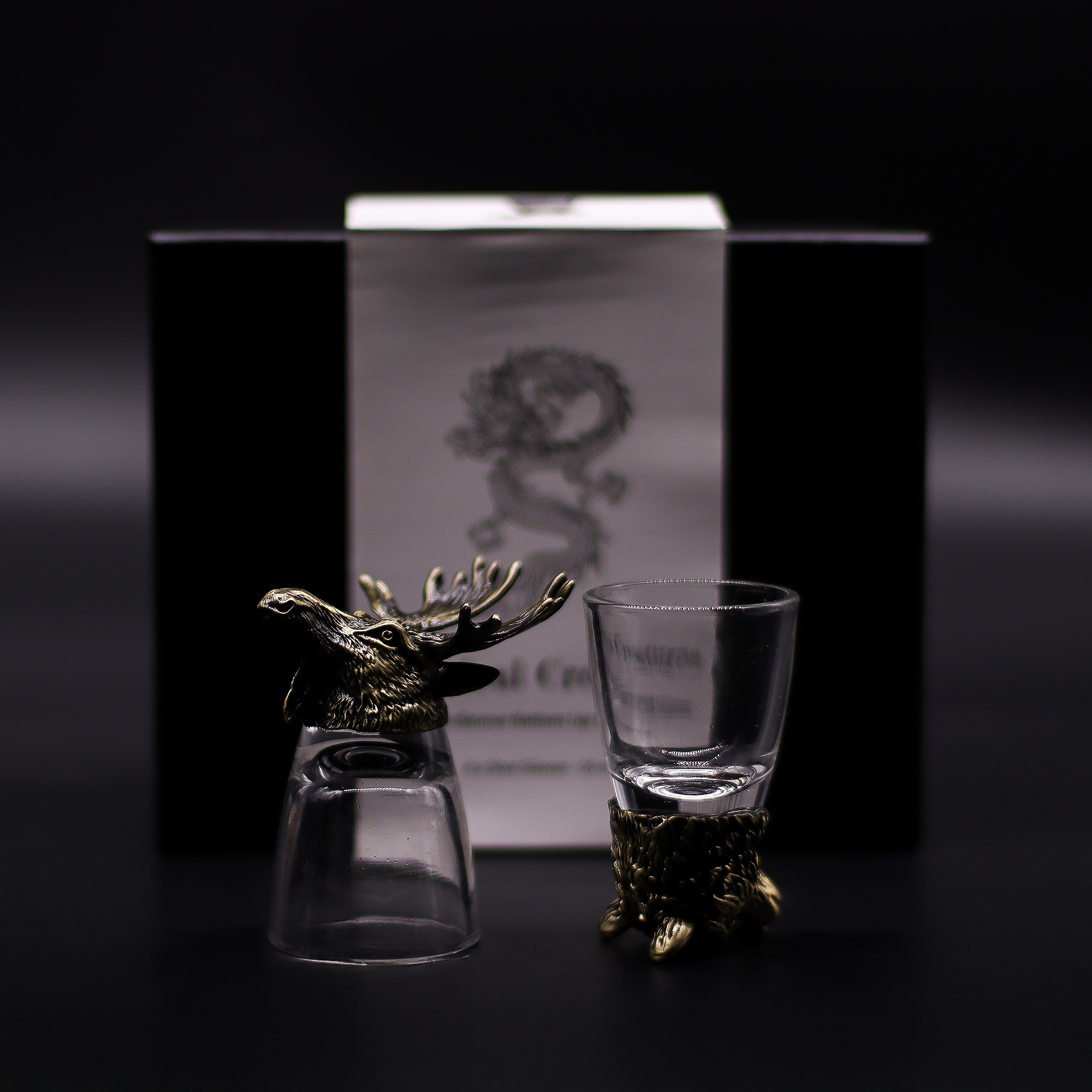 Each 50ml glass rests on a sculpted brass base featuring forest animals such as the stag, bear, eagle, goat, boar, and wolf. When flipped upside down, the figures reveal themselves in full detail, turning each glass into a small work of art that doubles as décor.