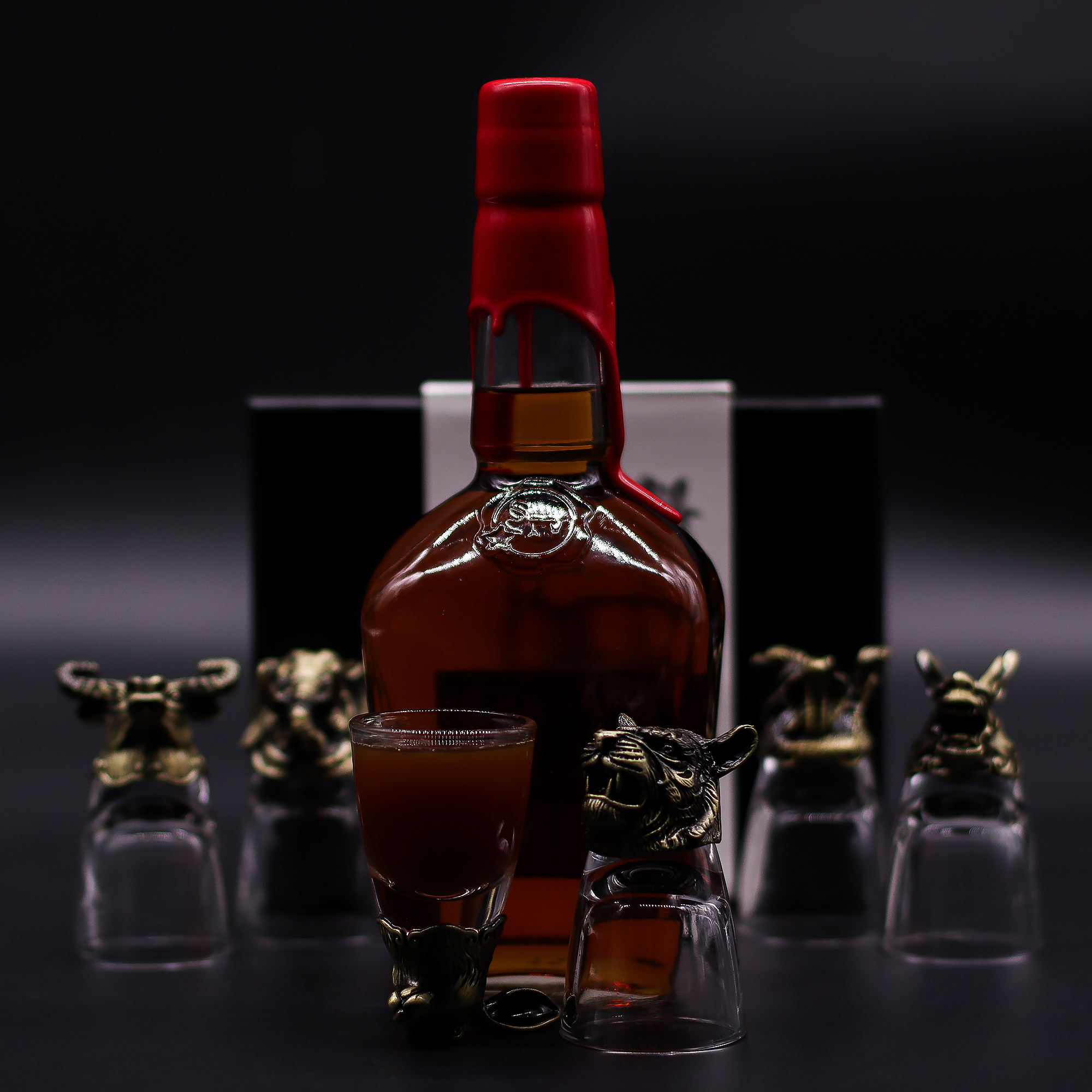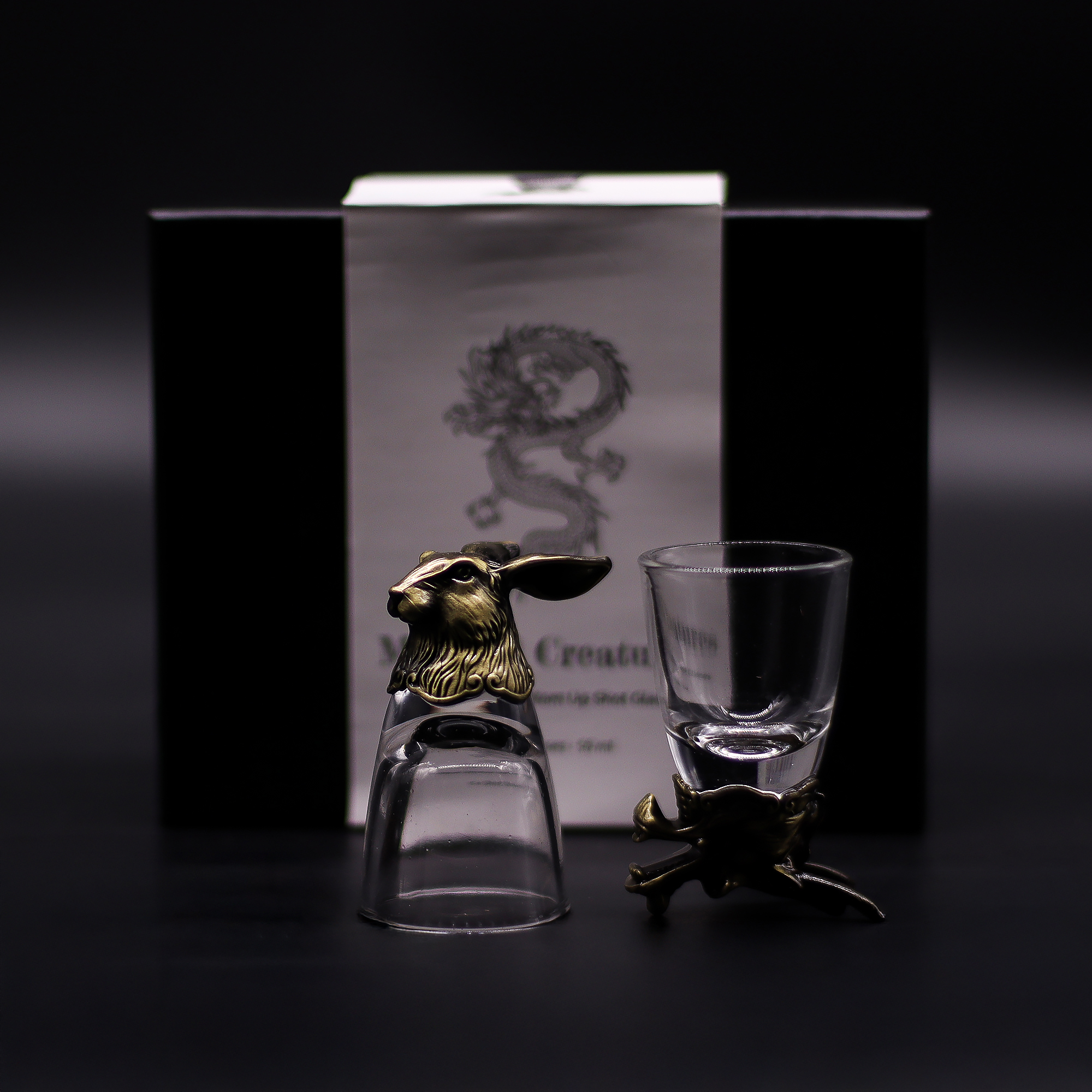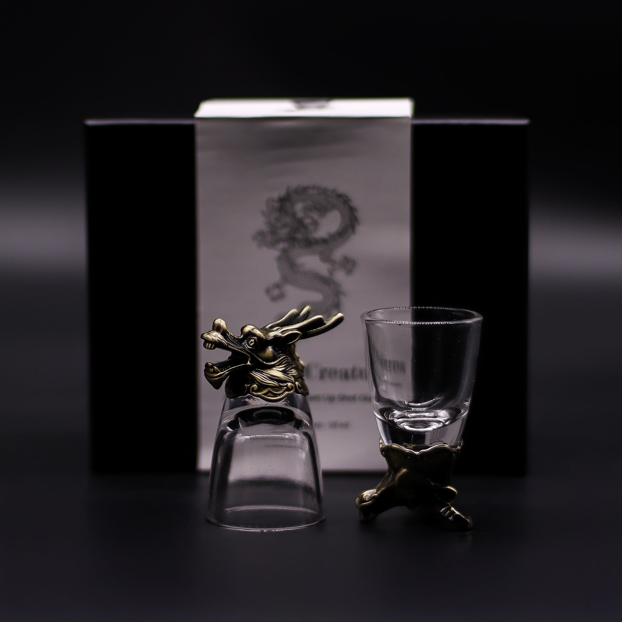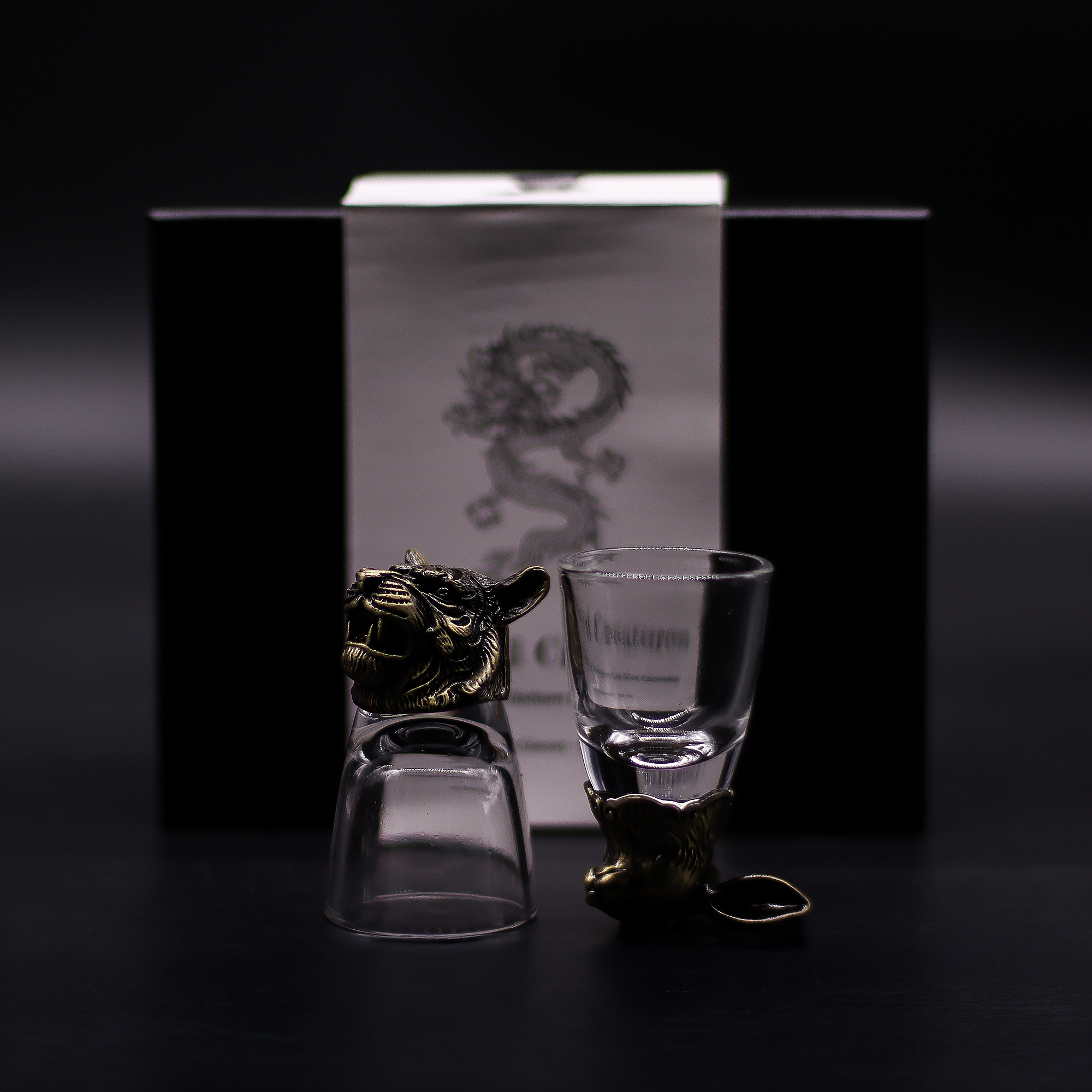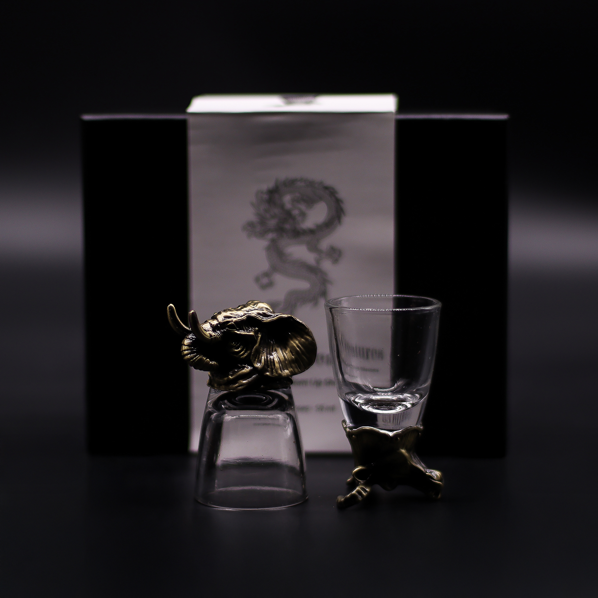 This 6-piece set of 50ml shot glasses features extraordinary brass bases shaped into mythical beings — including dragon, tiger, cobra, elephant, goat, and ram — each sculpted with beautiful attention to detail. When inverted, the figures become stunning mini sculptures; when upright, their horns and wings form a stable, eye-catching base.
