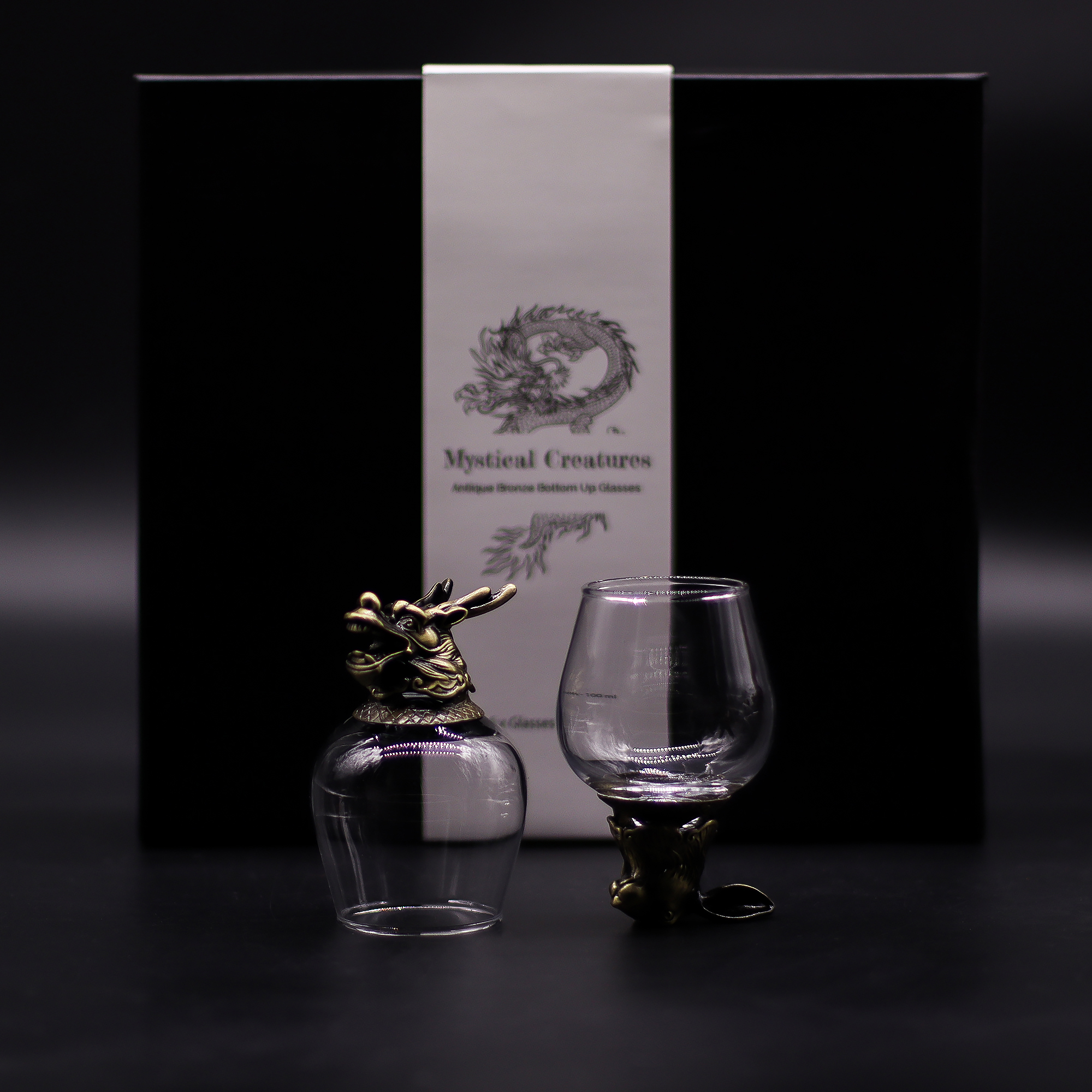 Each glass features a heavy brass base sculpted into mythical beings such as the dragon, cobra, tiger, elephant, goat, and ram — beautifully detailed and full of character. When turned over, the figure is revealed in all its glory, making each piece a small work of art.