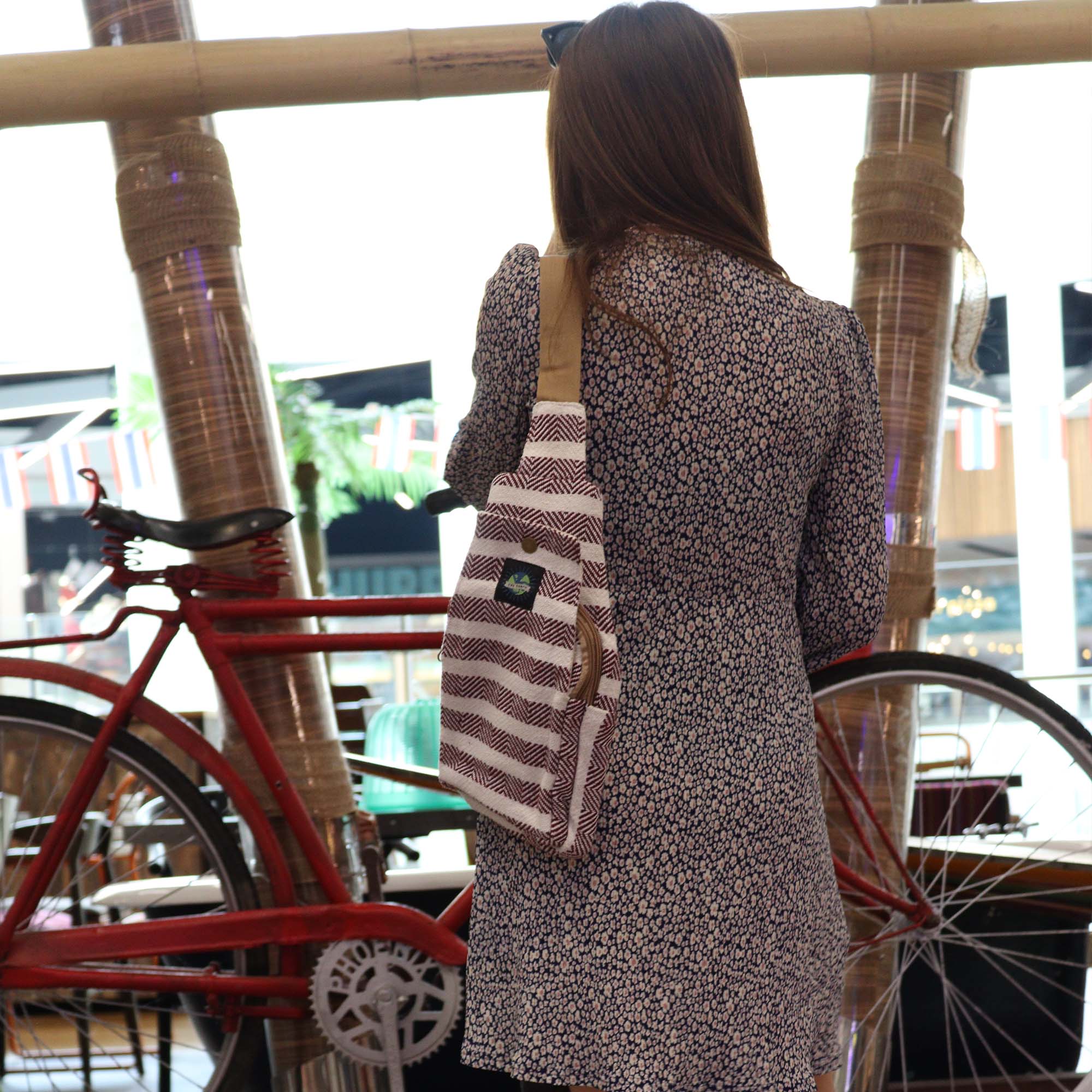 Discover our Natural Cotton Cross Body Bag in Burgundy & White: stylish, sustainable, and functional. Made from fine natural cotton, with adjustable straps and secure pockets.