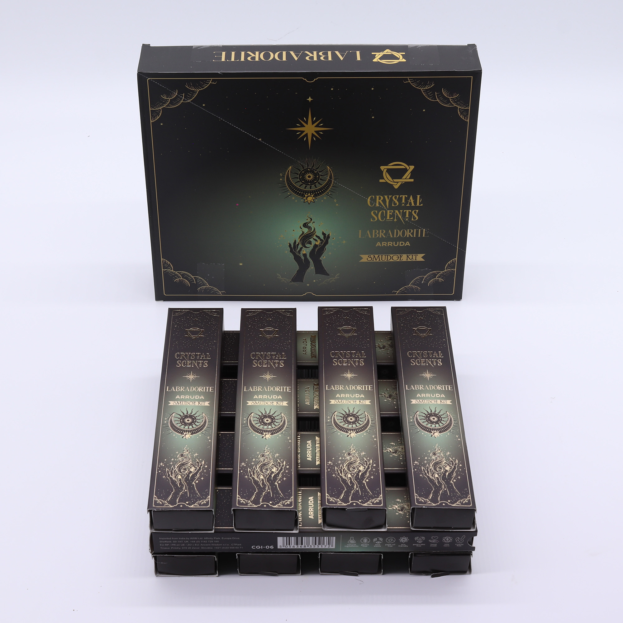 Each pack includes 10 handcrafted smudge sticks and a genuine Labradorite crystals making it ideal for spiritual boutiques and wellness-focused retailers. Customers often choose this pairing during transitional phases or when they want to create a more grounded, intuitive environment.