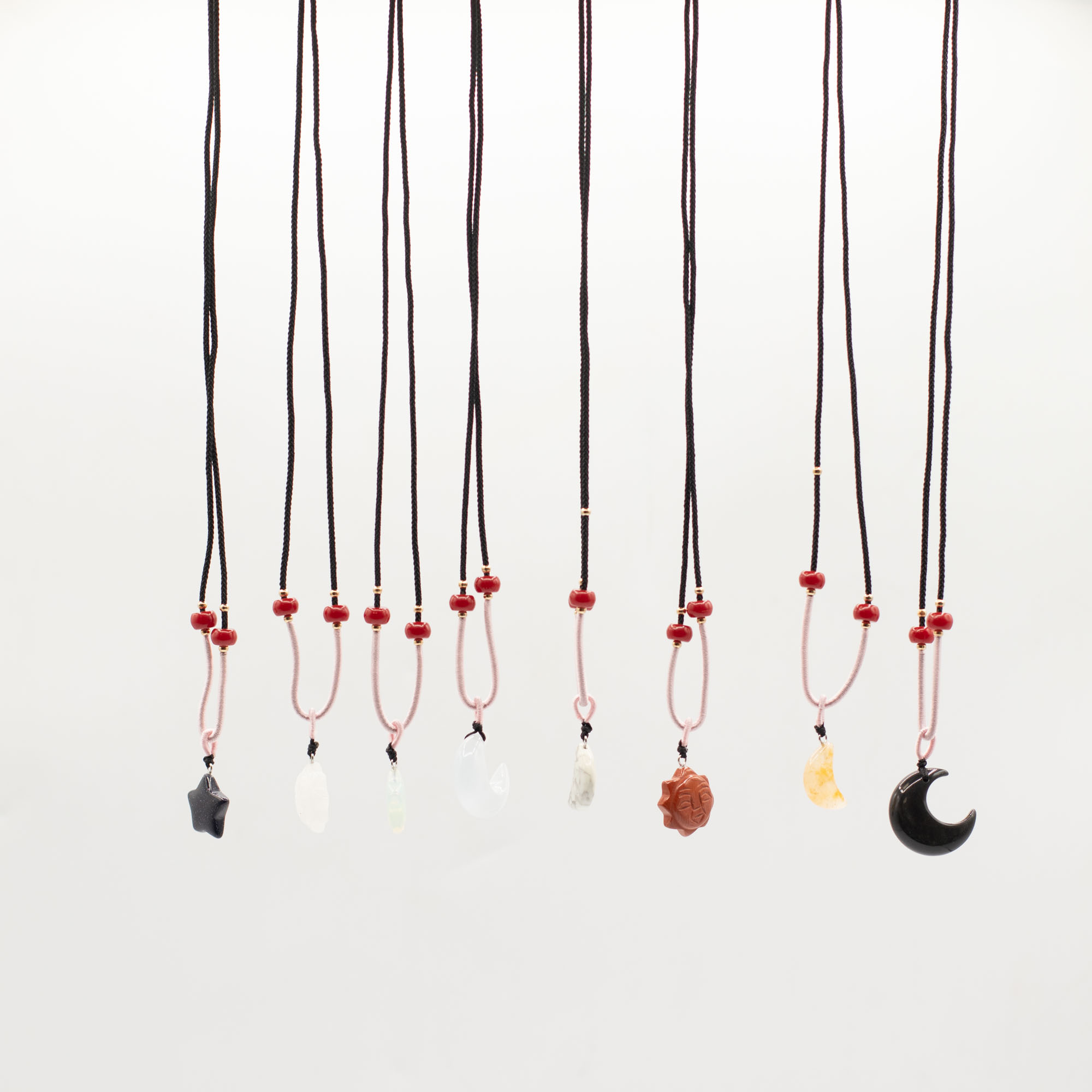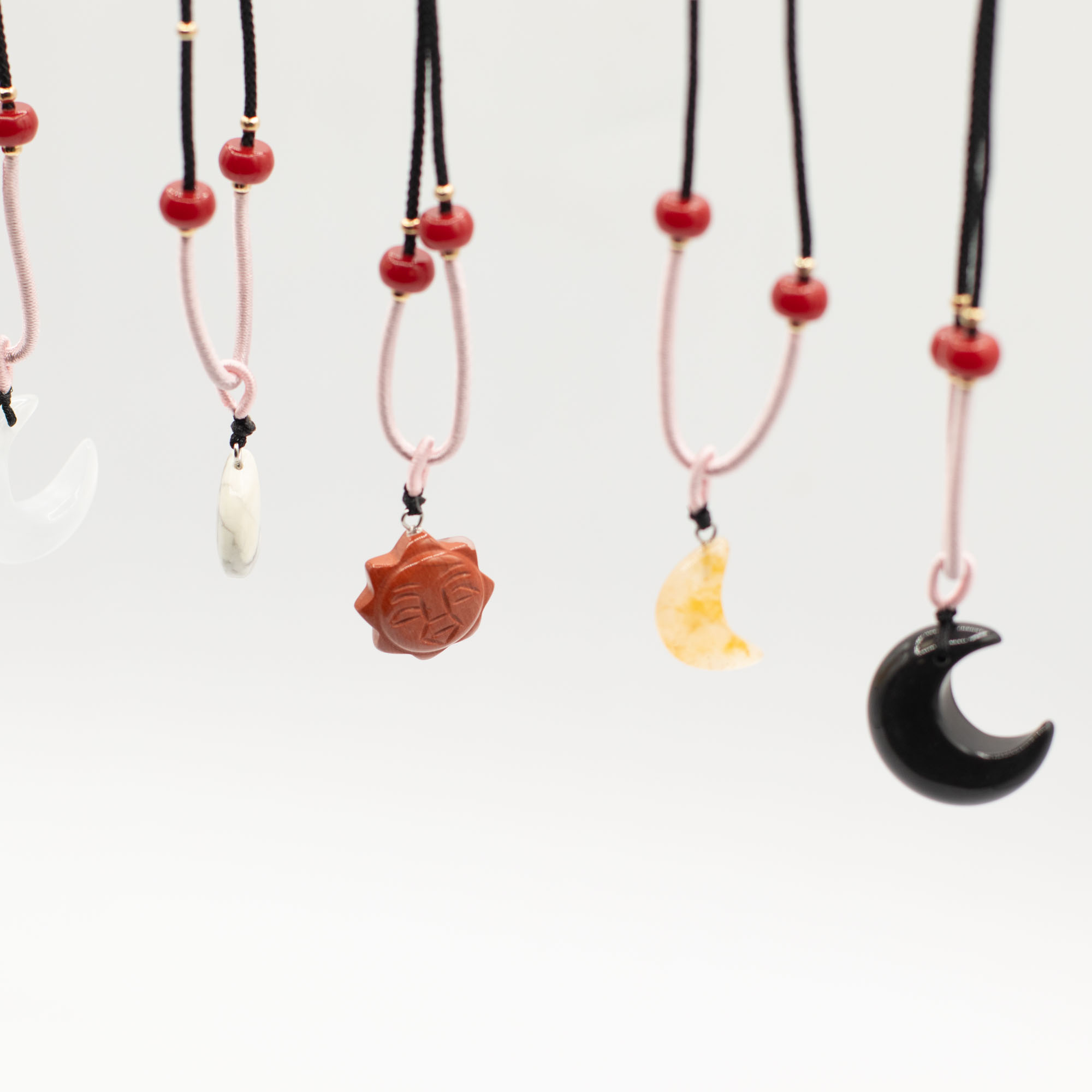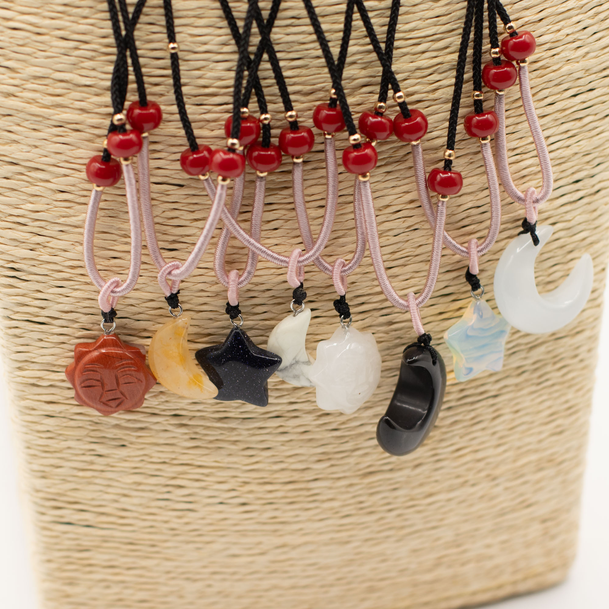 The assortment features popular cosmic motifs, including suns, moons and stars, each shaped from natural gemstones. Variations in tone and texture ensure every piece feels individual while maintaining a cohesive celestial theme.