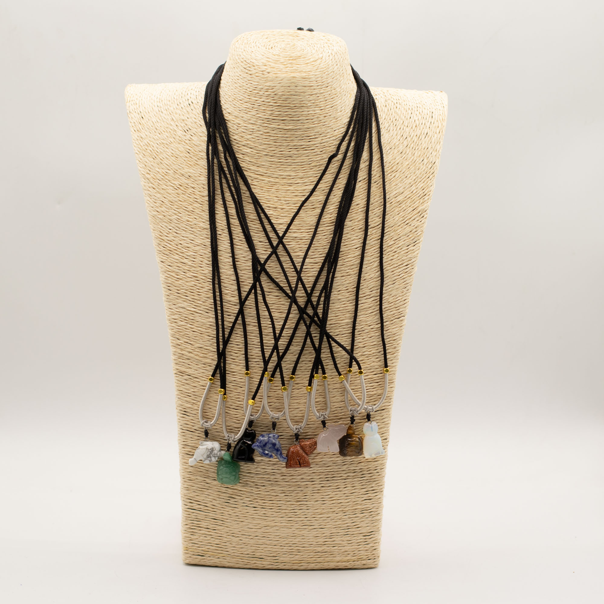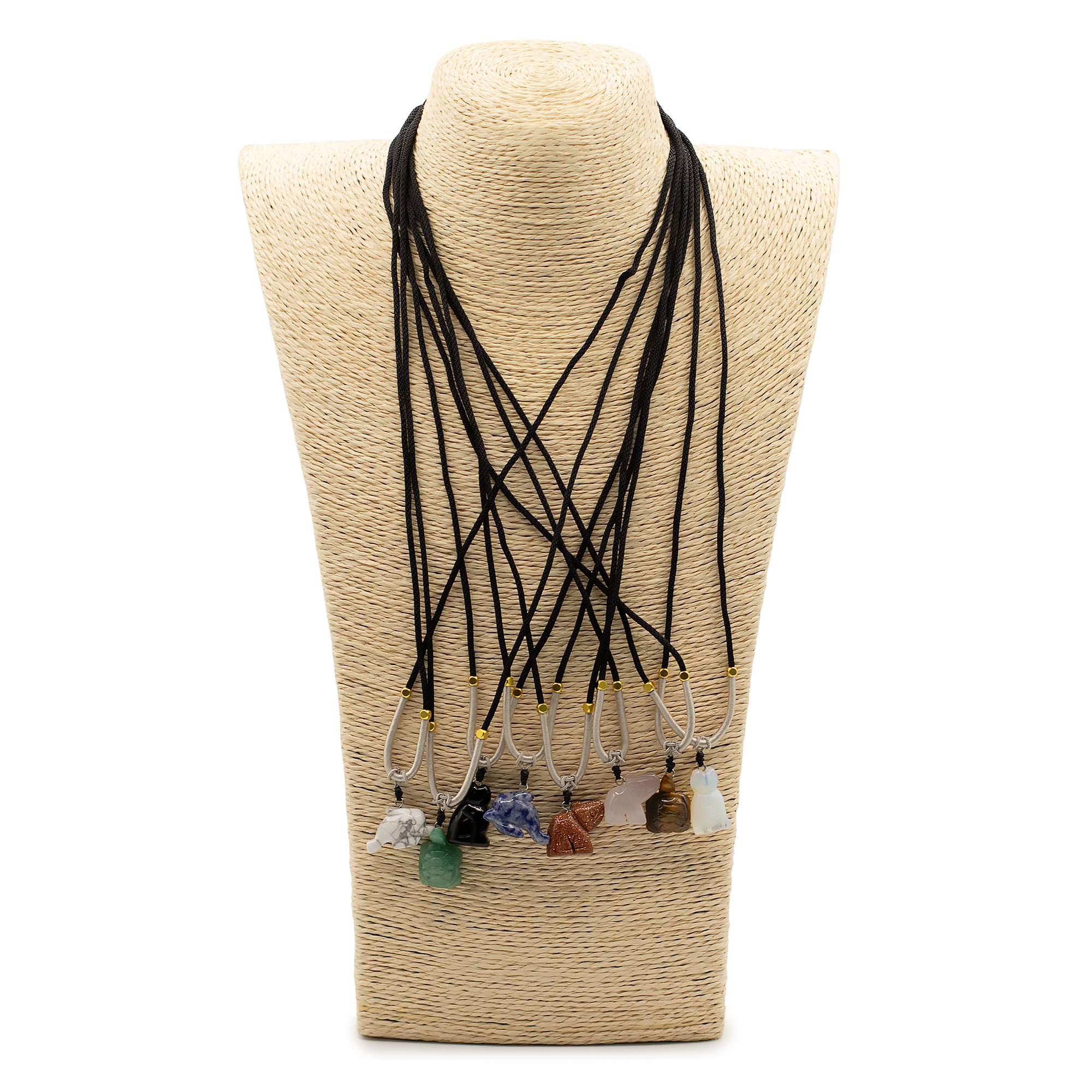 Enhance your jewellery selection with the 8x Cord Necklace Gemstone Pendants – Animals Collection. This mixed set brings together hand-carved gemstone pendants shaped into popular animal figures, offering strong visual appeal for gift retailers, crystal shops and boutique stores.