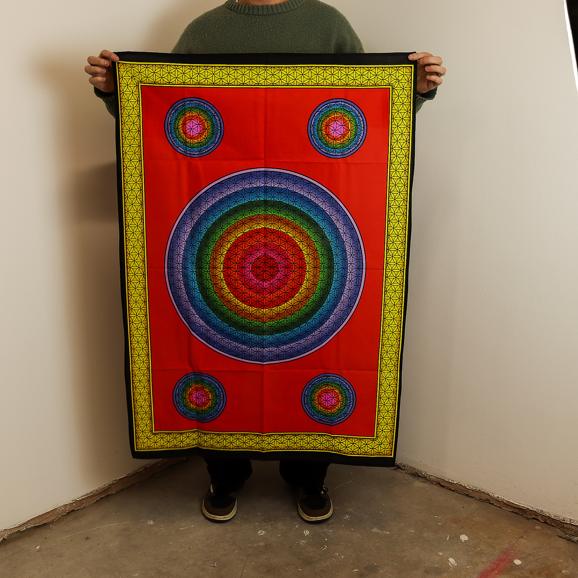 The bright tones and symmetrical pattern appeal to those seeking harmony or energy in their space. Easy to fold, stock, and display, it’s an affordable product with excellent visual impact — ideal for shops focusing on home décor, mindfulness gifts, or festival collections.