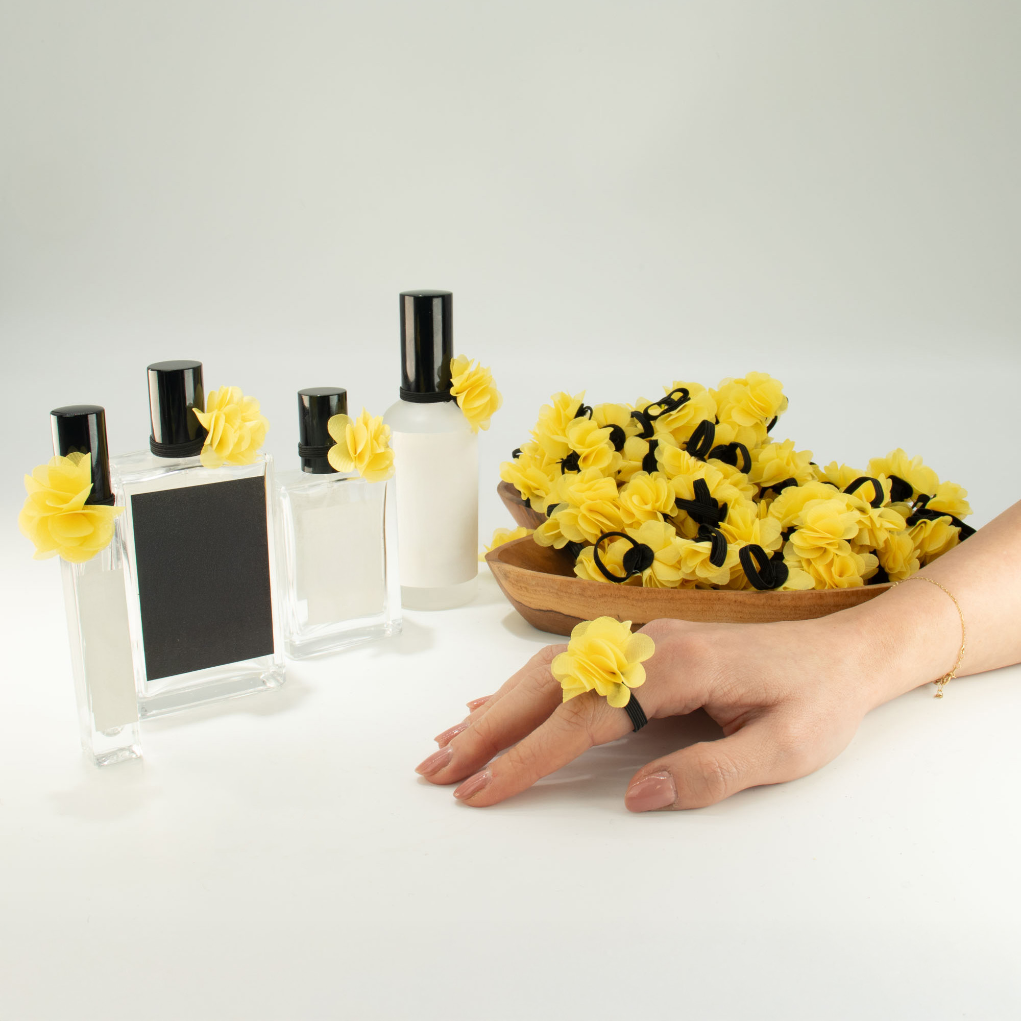 Yellow Chiffon Scent Rings, supplied in packs of 100, offer a bright and engaging way to present fragrances in retail environments. Each ring features a light chiffon flower mounted on a flexible elastic band, designed to hold perfume or fragrance oil and release the scent gradually while worn.