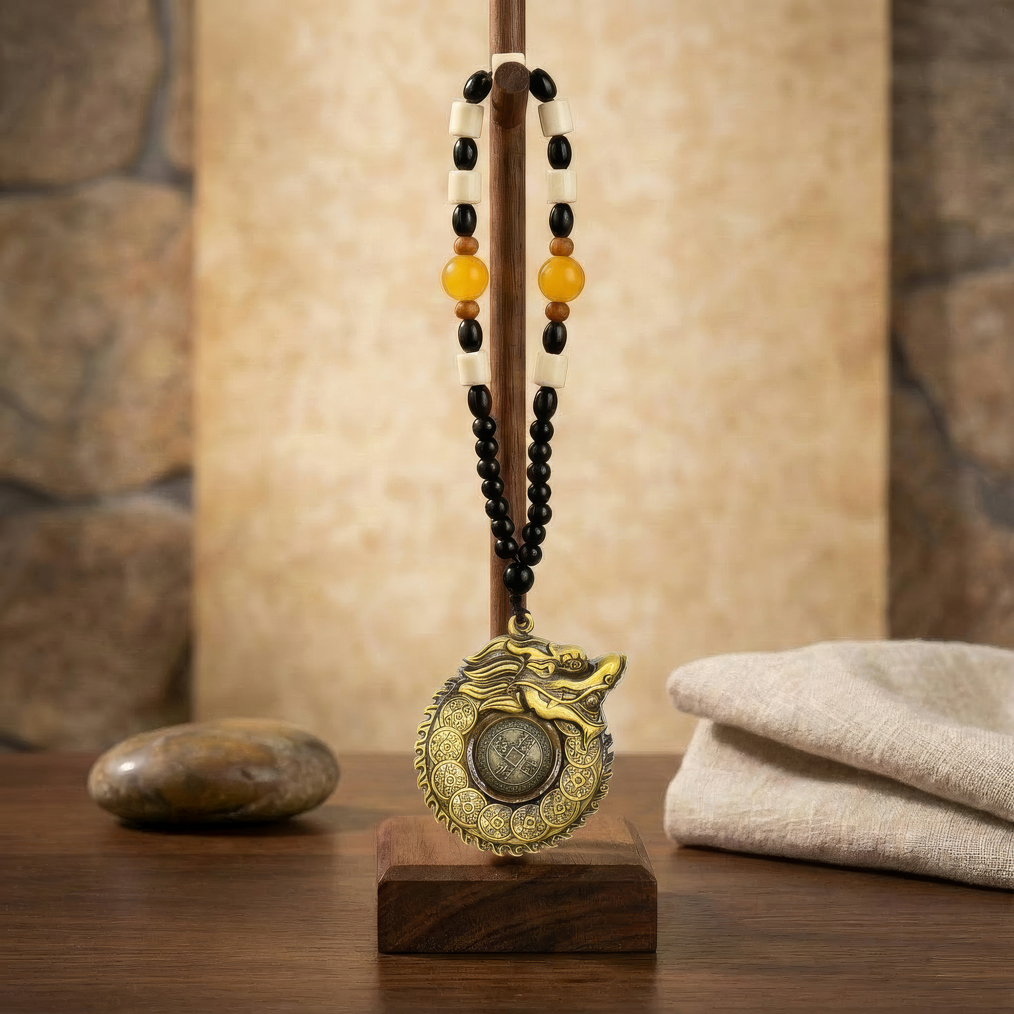 Made from solid brass with a detailed antique-style finish, the piece has both visual presence and symbolic weight. The flowing dragon form and surrounding coin motifs add movement and depth, while the stylised Chinese characters are used symbolically as blessings for fortune and success. Suspended from a decorative beaded cord in balanced black, cream, amber-toned and wooden beads, it is traditionally placed in offices, shops, near entrances, desks, or wealth and career areas.