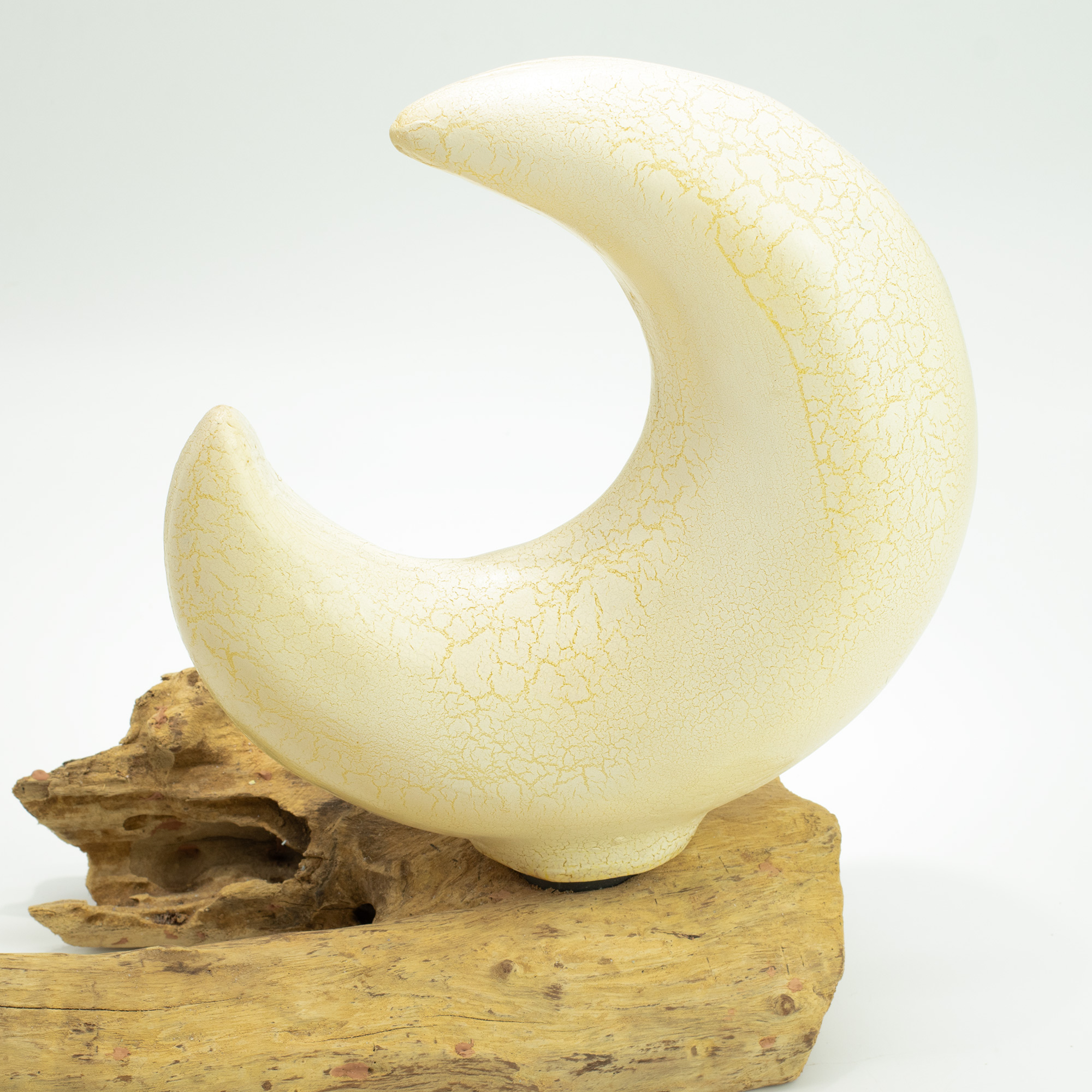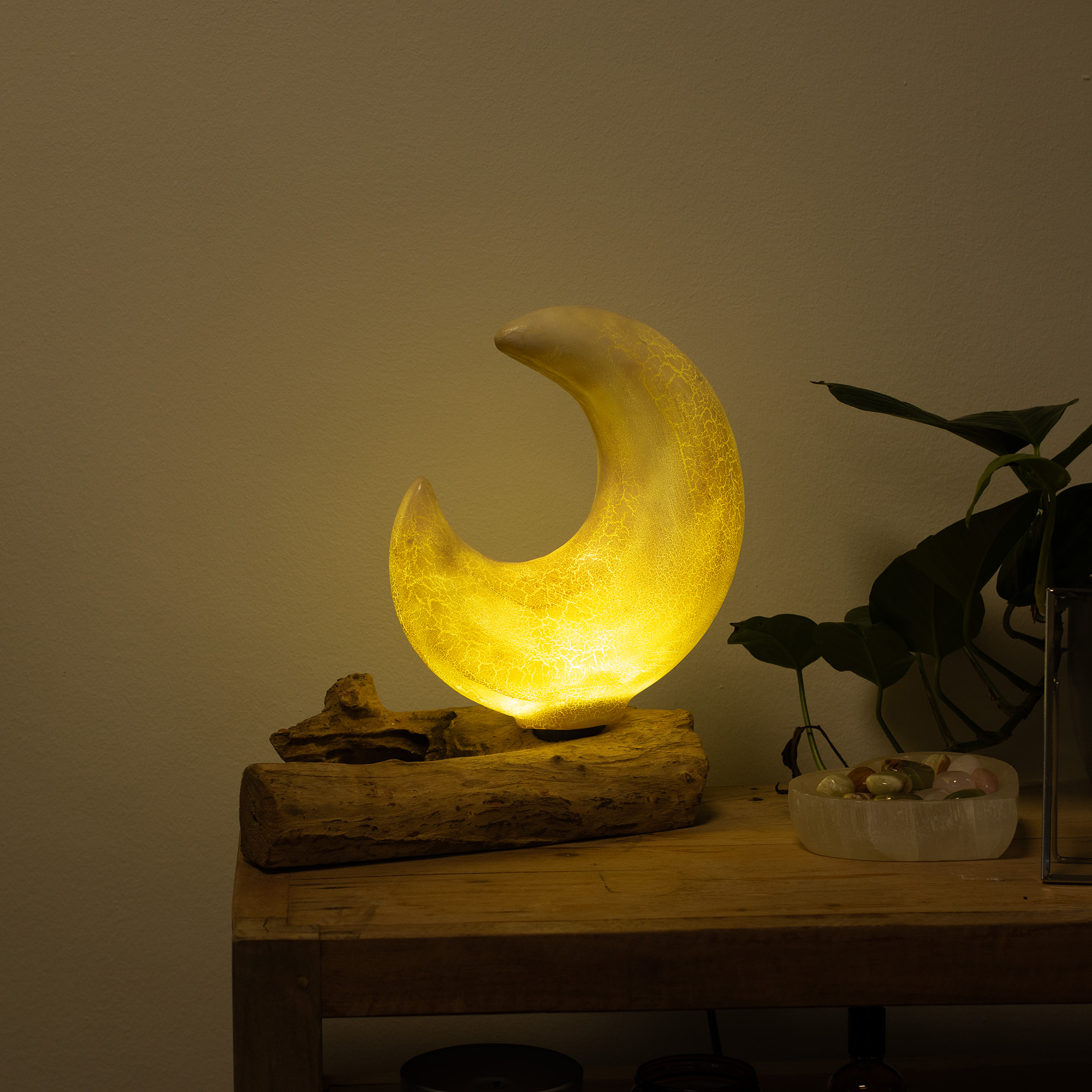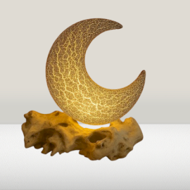 The DriftGlow Lamp Crackle Half Moon Shade – Yellow is designed to introduce a warm, understated glow into interior spaces. When switched on, it emits a soft golden light that settles gently into the room, creating a relaxed atmosphere. The half moon shade features a smooth, sculptural form with a fine crackle finish that subtly interacts with the light.