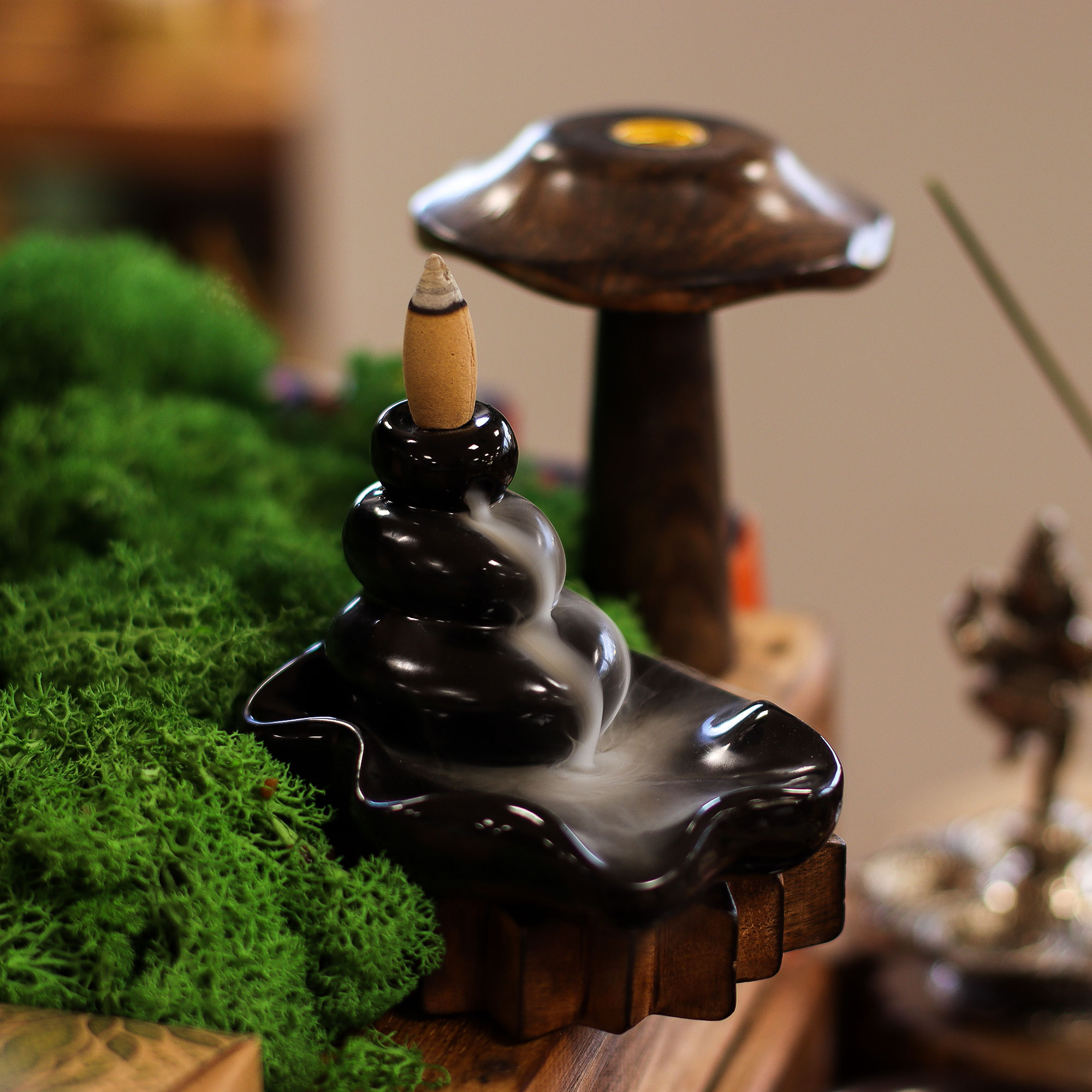 Backflow incense cones are also known for their beautiful and mesmerising smoke flows. When burned in a backflow incense burner, the smoke cascades down the burner, creating a waterfall-like effect. This can be a visually appealing addition to any home or office.
