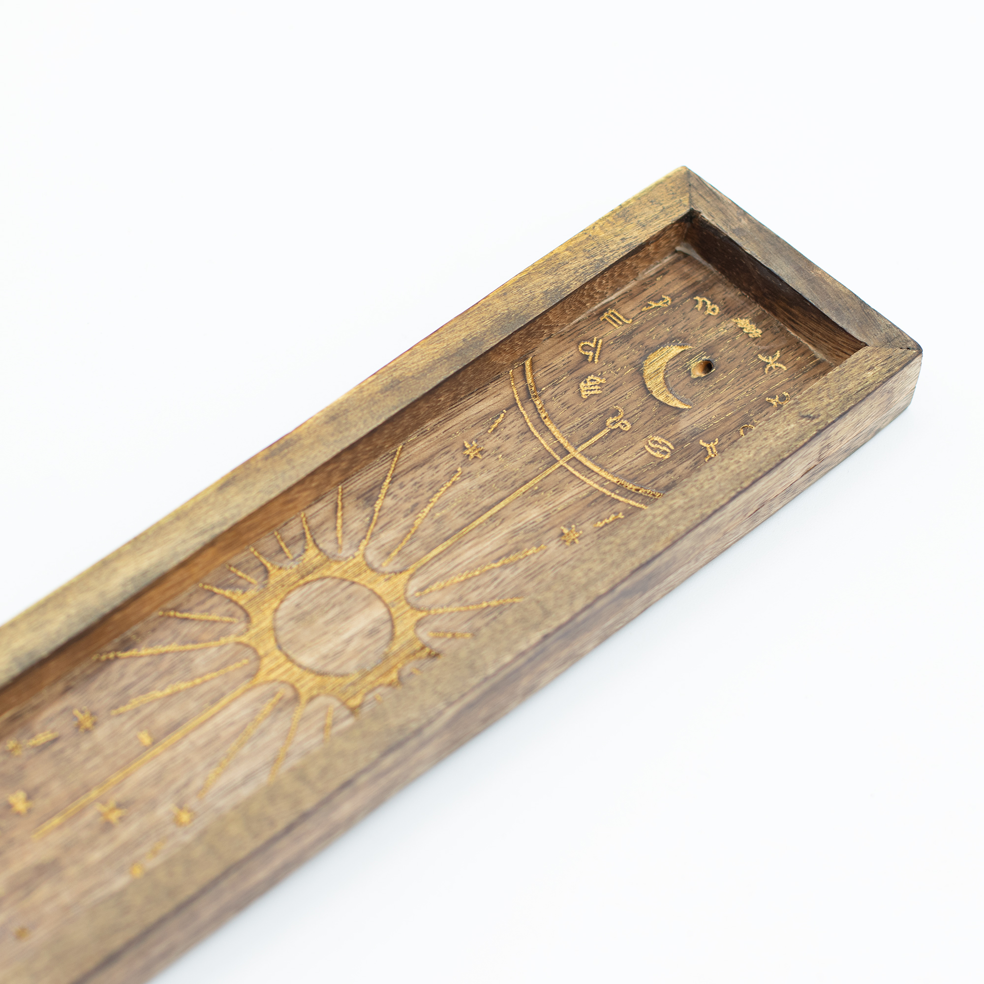 Crafted from wood with a warm rustic tone, each tray features a sunburst motif surrounded by zodiac star details. There’s a designated slot for stick incense, with raised edges to help catch the ash. The elongated tray shape is ideal for displaying tumbled stones or placing alongside other spiritual tools at the till point or altar section.