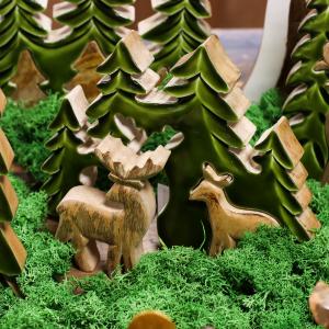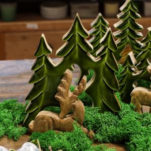 The range features everything from charming tree silhouettes to serene deer scenes, blending rustic wood textures with vivid green enamel details for a truly striking display. It includes both decorative figures and functional bowls shaped like leaves and evergreens. These items are perfect for creating captivating, nature-inspired displays all year round.