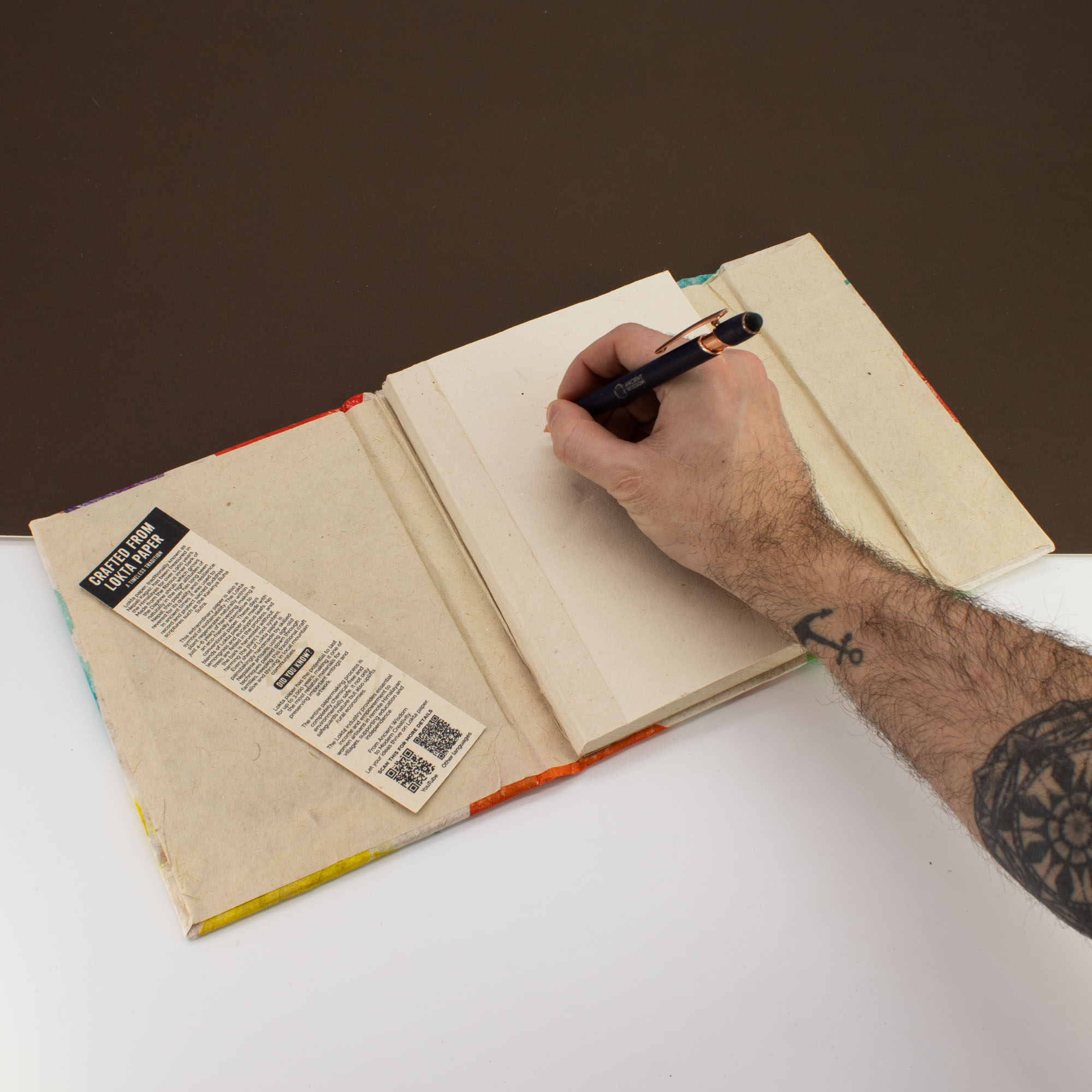 The bright exterior makes this notebook especially appealing for artists, children, creatives, or anyone who enjoys writing in vibrant surroundings. At 21x15cm, it’s a generous size for journaling, sketching or mixed media notes. The combination of a sturdy handmade cover with soft pages gives it a cheerful yet crafted look that stands out on the shelf. These notebooks are a great choice for retailers wanting to add something unusual and joyful to their stationery collection. Whether placed in a colourful display or sold alongside matching handmade paper items, they draw attention and curiosity.