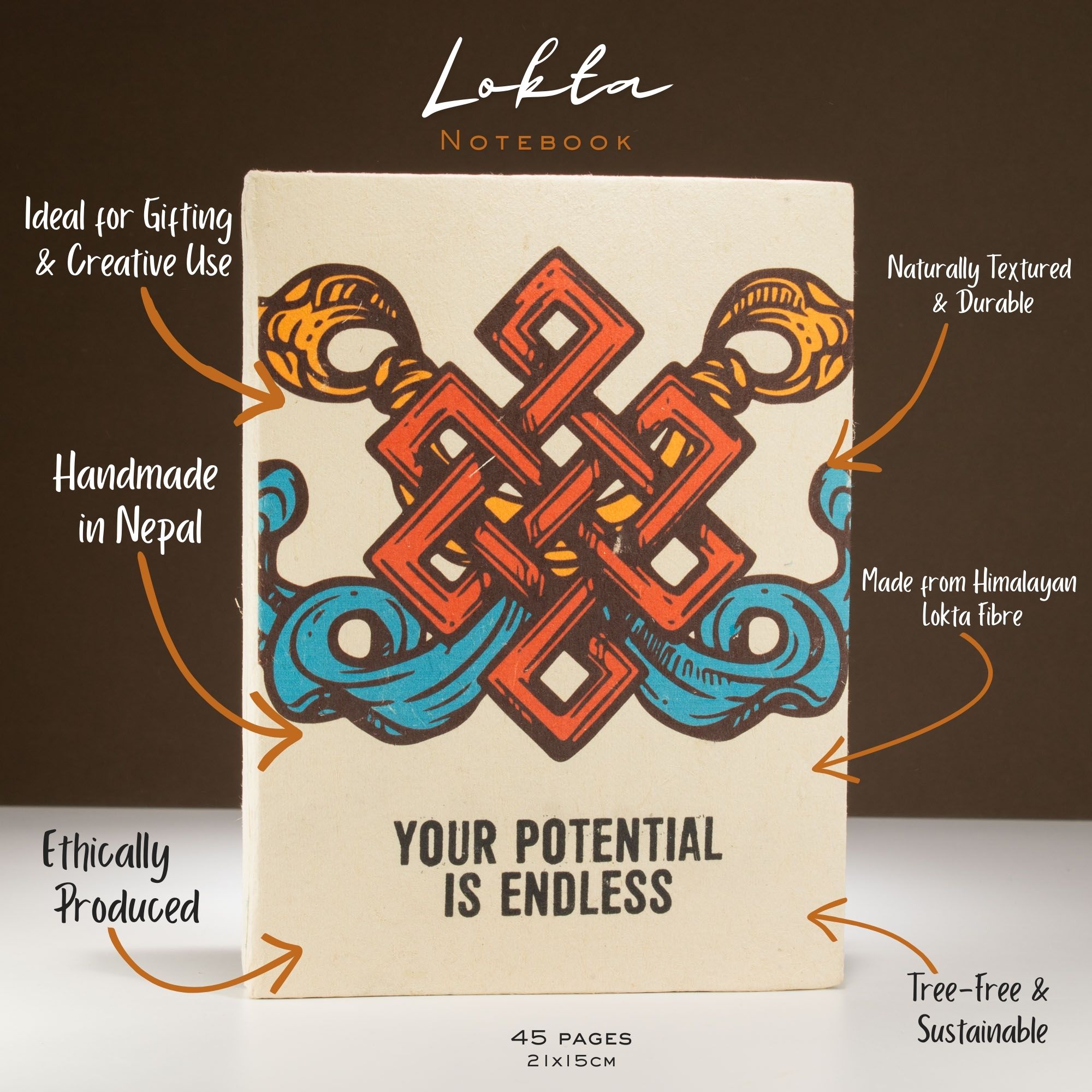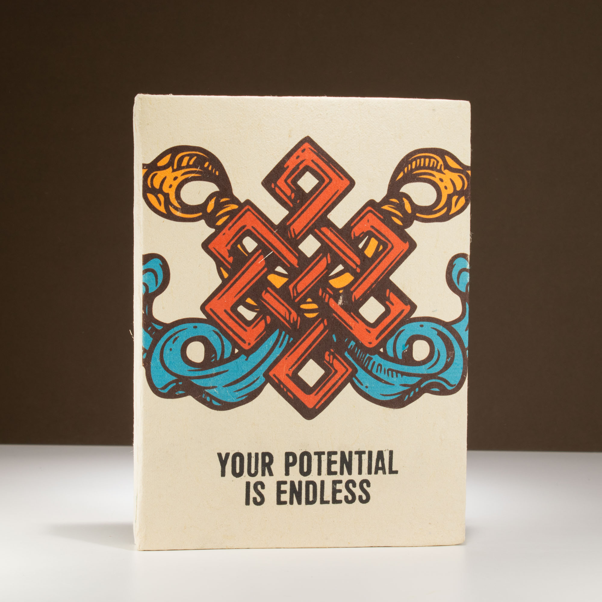 Uplifting and practical, this inspirational Lokta notebook makes a positive statement right from the cover. Featuring a bold red and orange motif with the phrase “Your Potential is Endless,” it encourages self-belief while offering high-quality, handmade appeal.