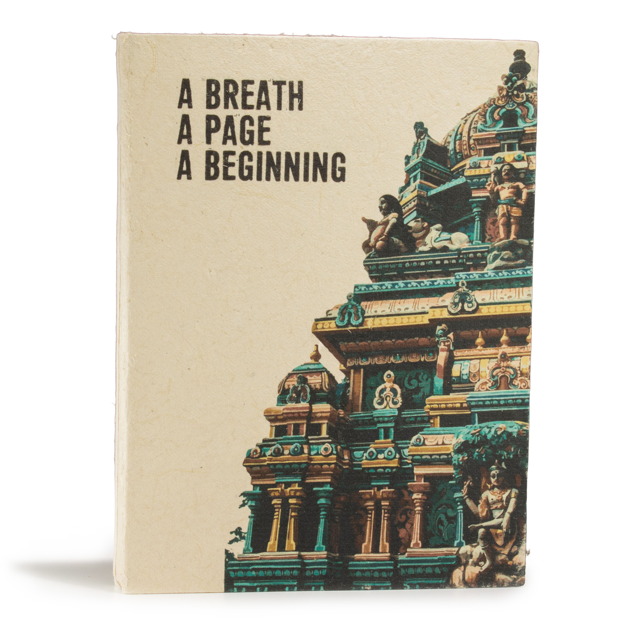 Calm and poetic, this notebook features an architectural temple motif paired with the phrase “A Breath, A Page, A Beginning,” evoking quiet focus and personal renewal. It’s a piece that appeals to customers looking for beauty and meaning in their writing tools.