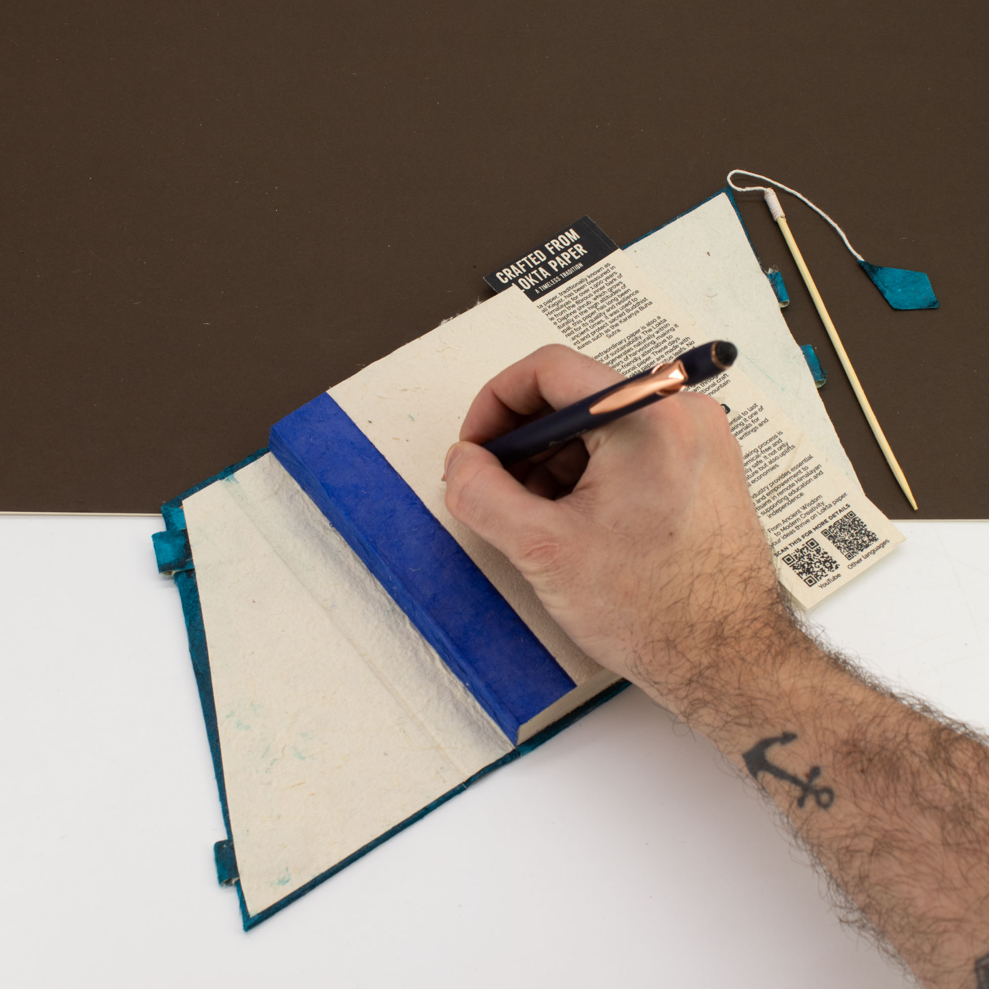 A slim bamboo locking rod secures the pages and adds a linear contrast to the organic paper texture. The compact format keeps the notebook portable and unobtrusive, suited to customers who prefer something refined and functional over decorative.
