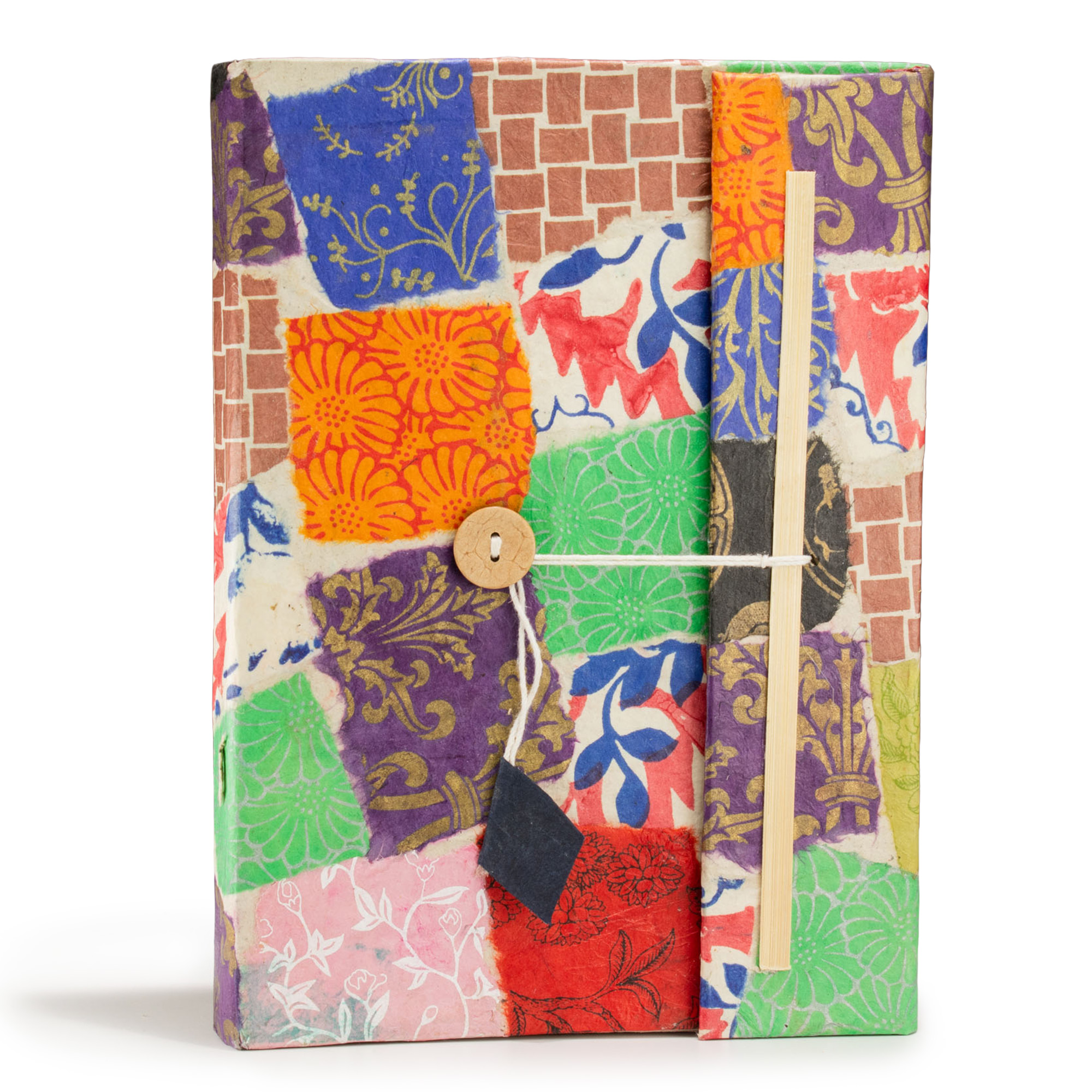 This patchwork Lokta notebook is designed to be visually expressive and deliberately irregular. The cover is formed from individually patterned paper sections, layered together to create a lively, collage-style surface where no two notebooks are ever quite the same.
