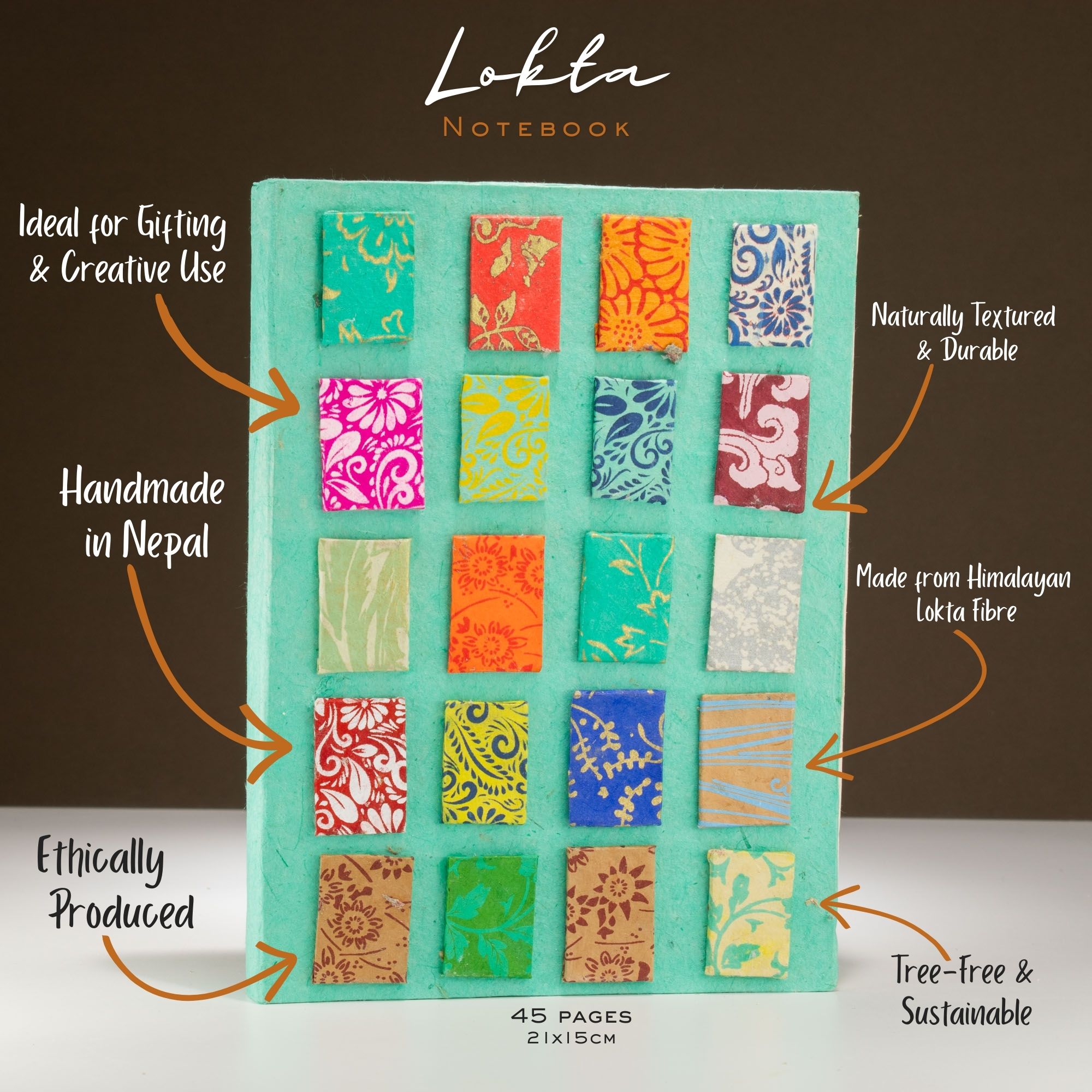 This Mini Tiles Lokta notebook plays with pattern rather than florals, using a grid of individually decorated paper panels to create a rhythmic, almost mosaic-like cover. Set against a teal background, each tile introduces its own colour and motif, giving the notebook a playful but well-balanced visual identity.