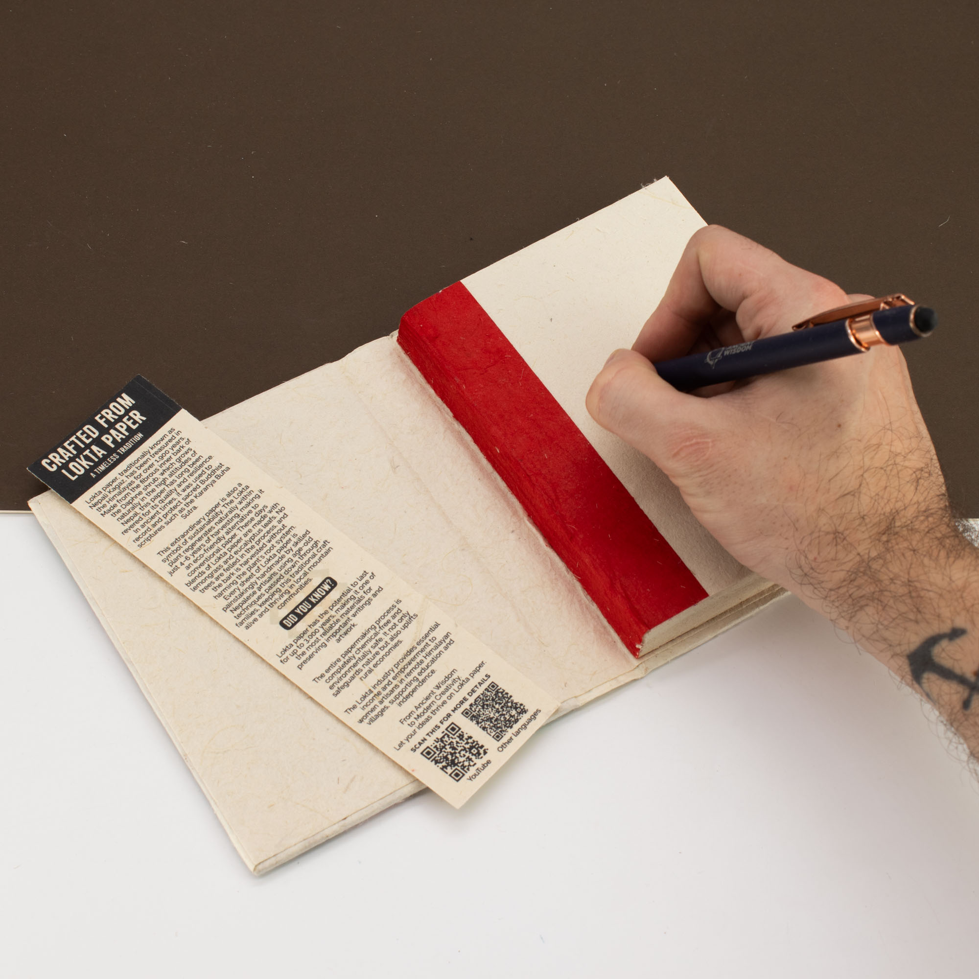 To make Lokta paper, the bark is stripped from the plant without damaging its roots. It's then soaked, pulped by hand, and spread into sheets using traditional wooden frames. These sheets are sun-dried and sometimes further embellished with petals, leaves, cotton fibres, or natural dyes. The process is labour-intensive but environmentally low-impact, often carried out in small village workshops as part of fairly traded, community-led production.