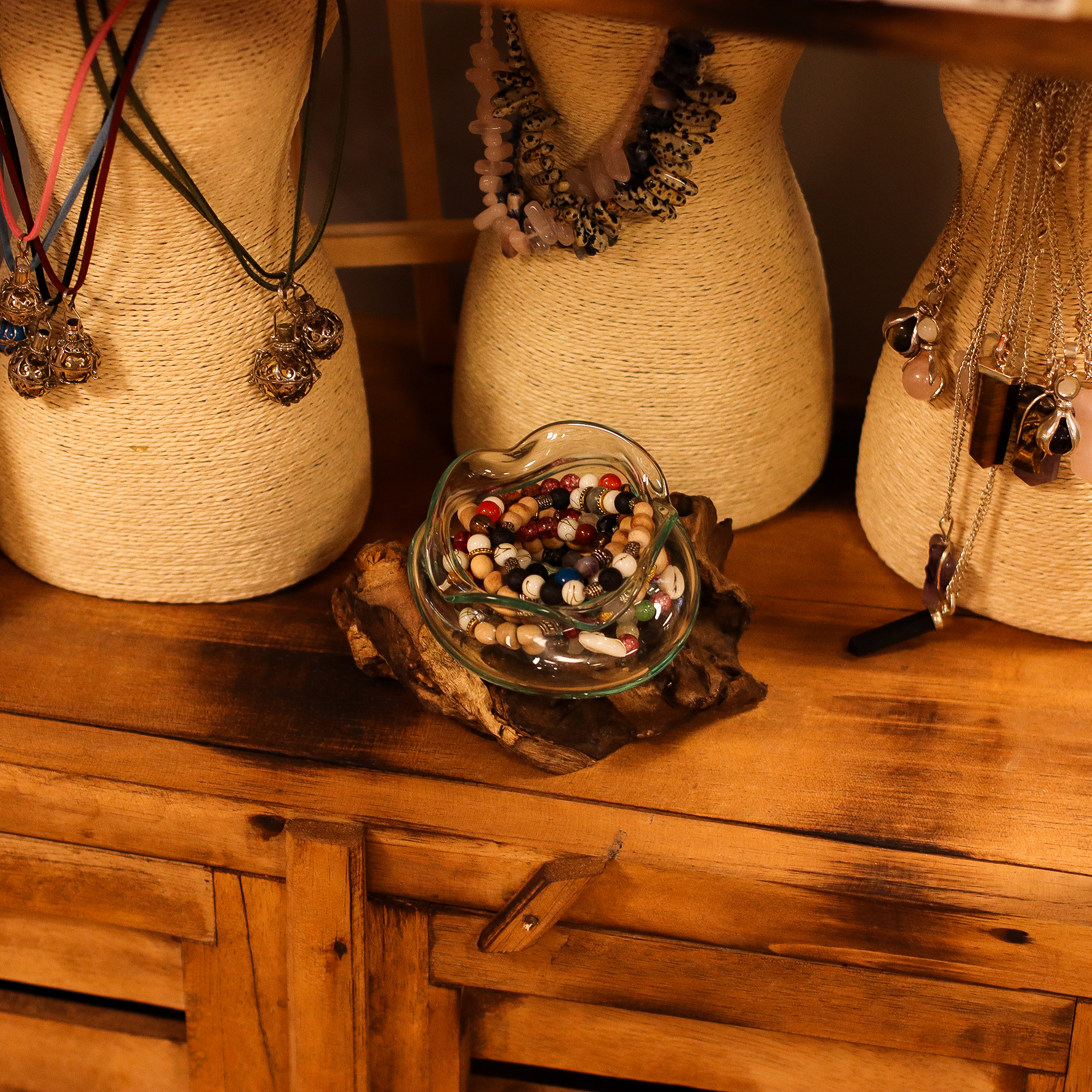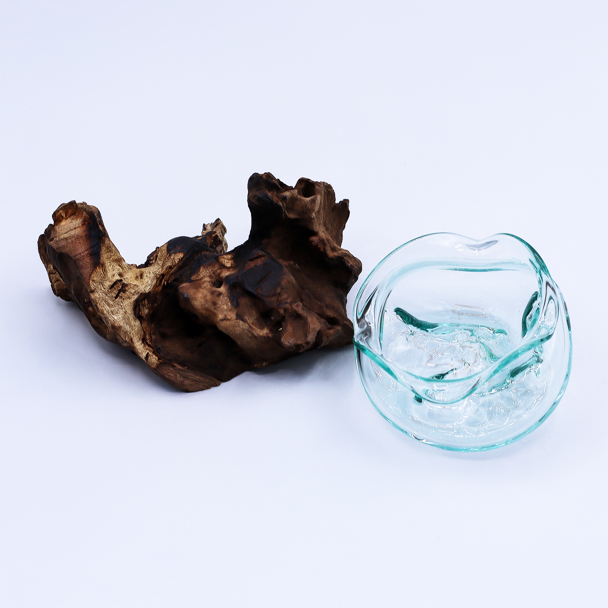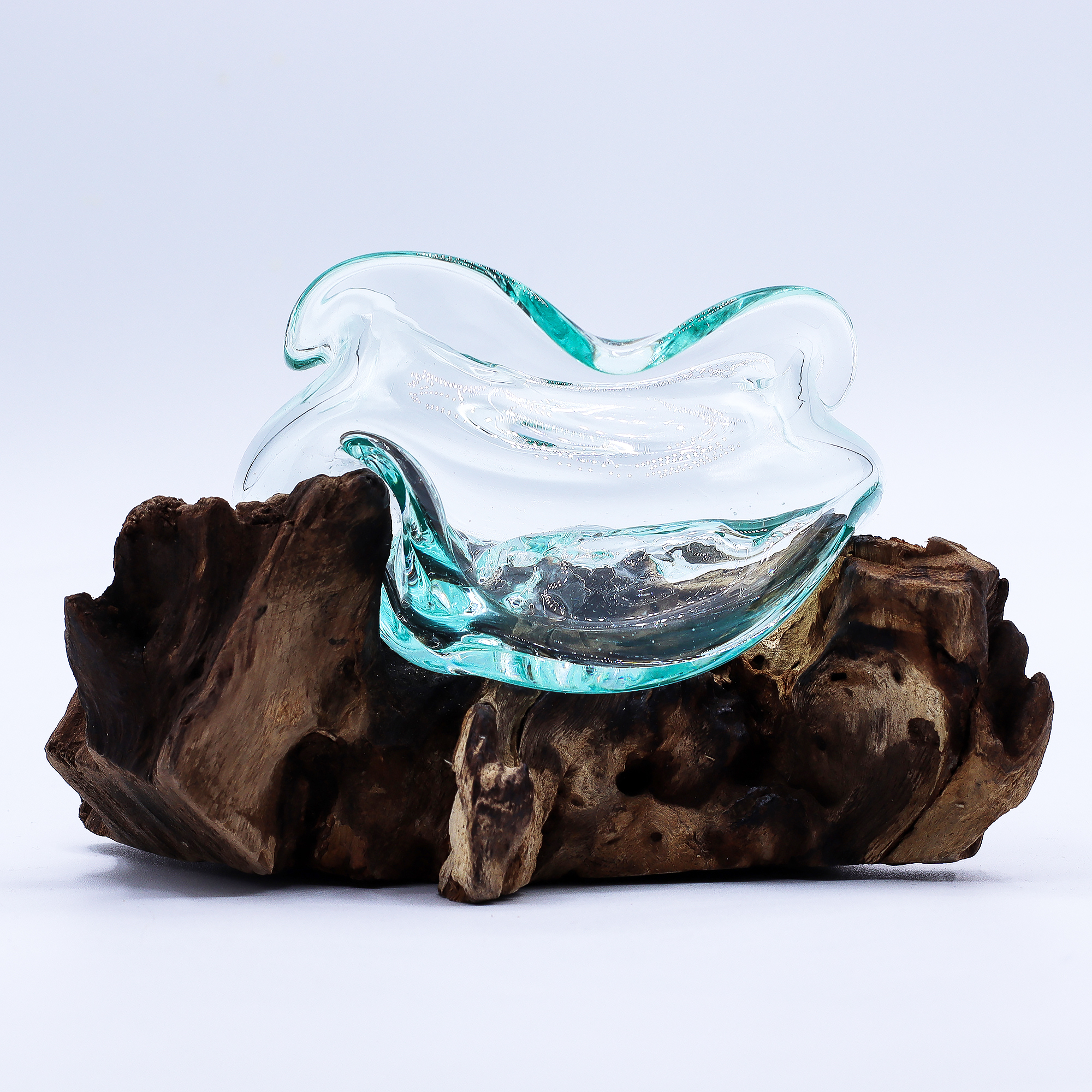 The molten glass is shaped directly over the wood, creating elegant ripples and organic curves that fit seamlessly with the base. Its sculptural design invites versatile display — perfect for holding tealights, floating flowers, shells, or gemstones.