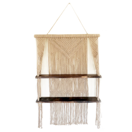 The rustic wood shelf is made from Albesia wood and it is carefully woven by macrame cotton ropes.