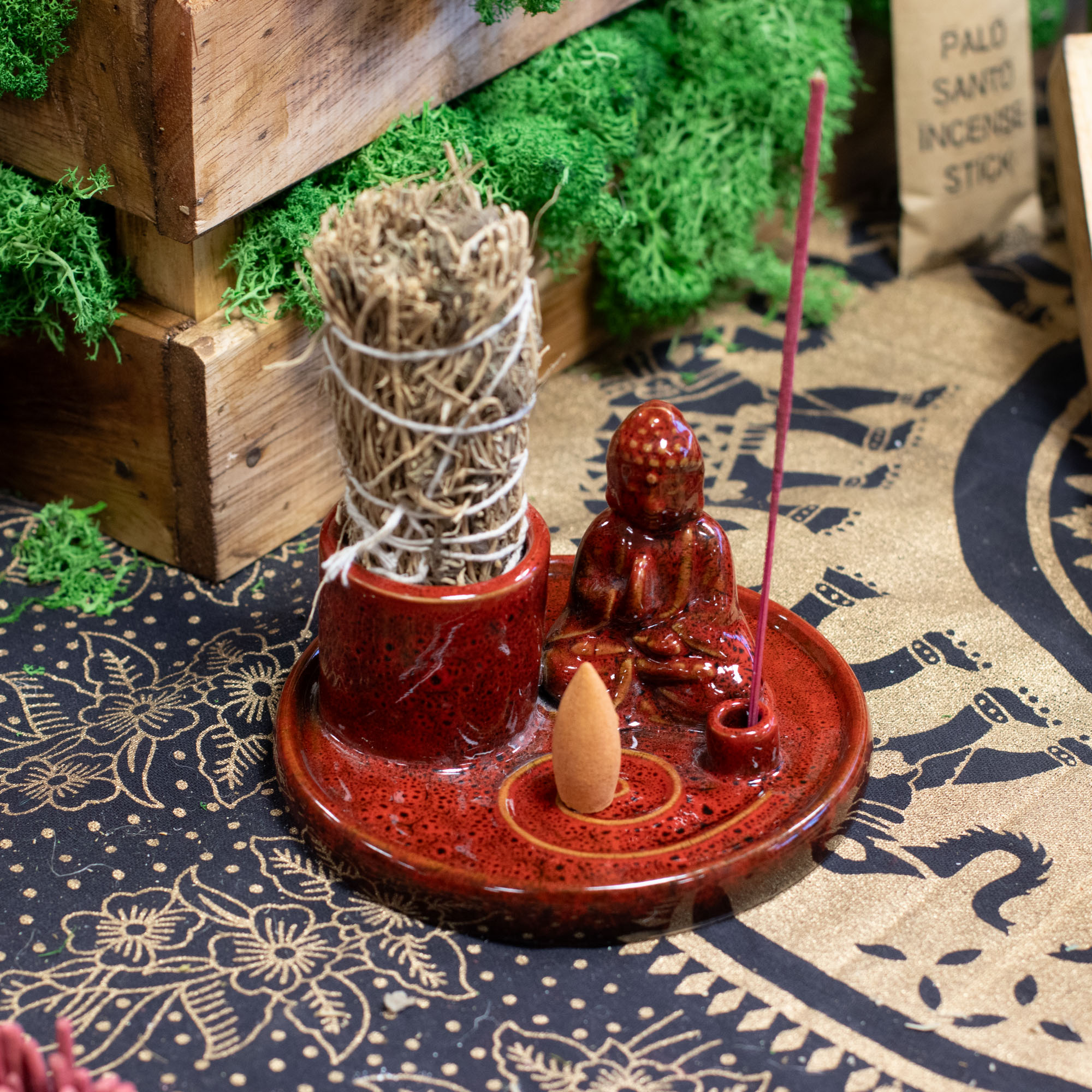 The design features a seated Buddha set on a circular plate with integrated holders for incense sticks and cones. The soft red glaze has an earthy character with subtle variations, giving each piece a handcrafted look that customers naturally connect with. Designed for everyday ritual use, it keeps ash neatly contained while also working as a decorative focal point.