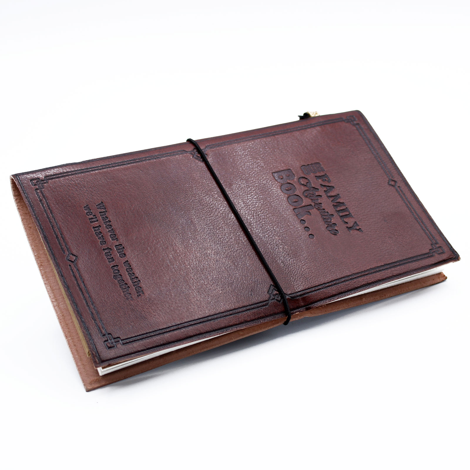 Handmade Leather Journal - Our Family Adventure Book - Brown (80 pages) can be used as a notebook, diary or sketchbook. Wrap around band - very posh.