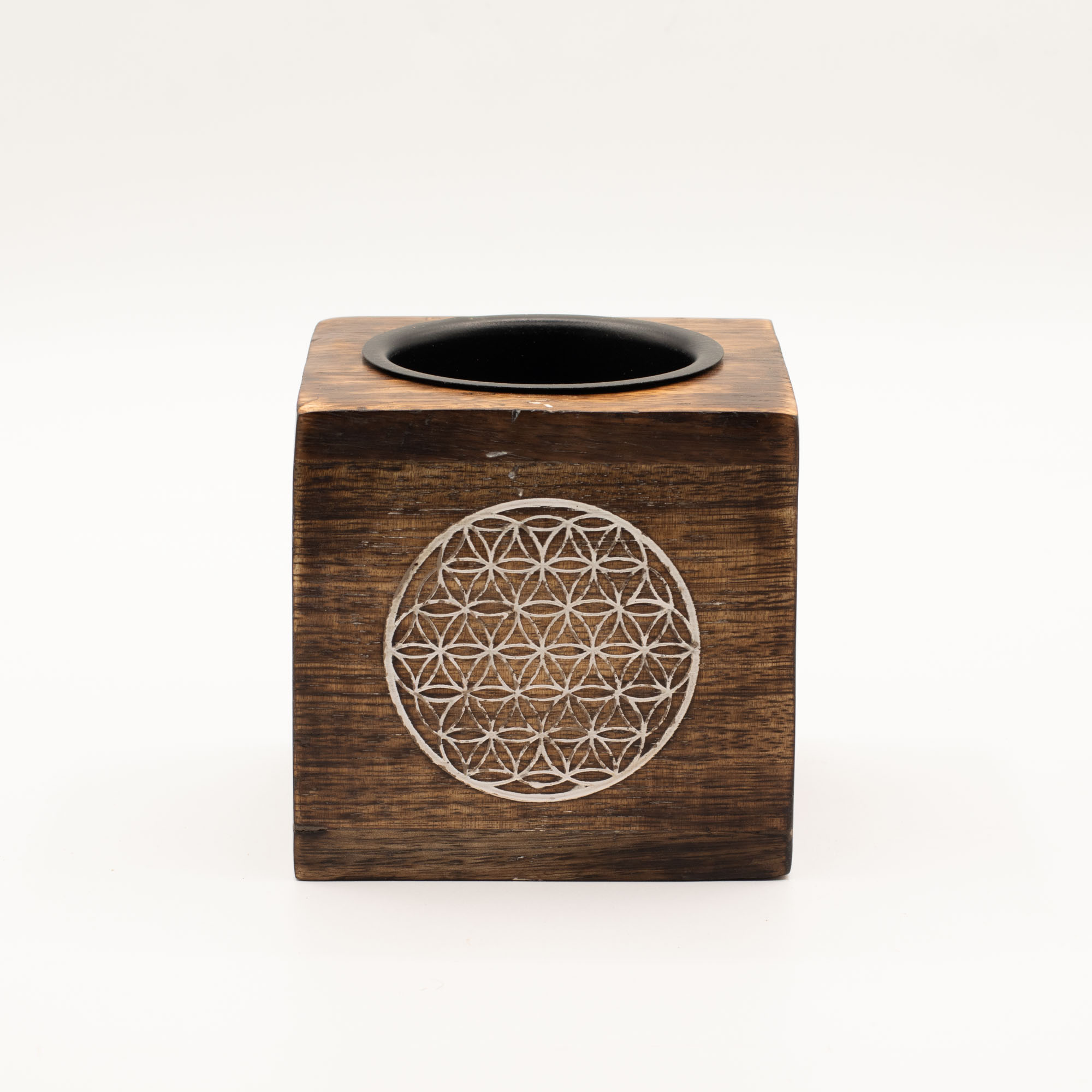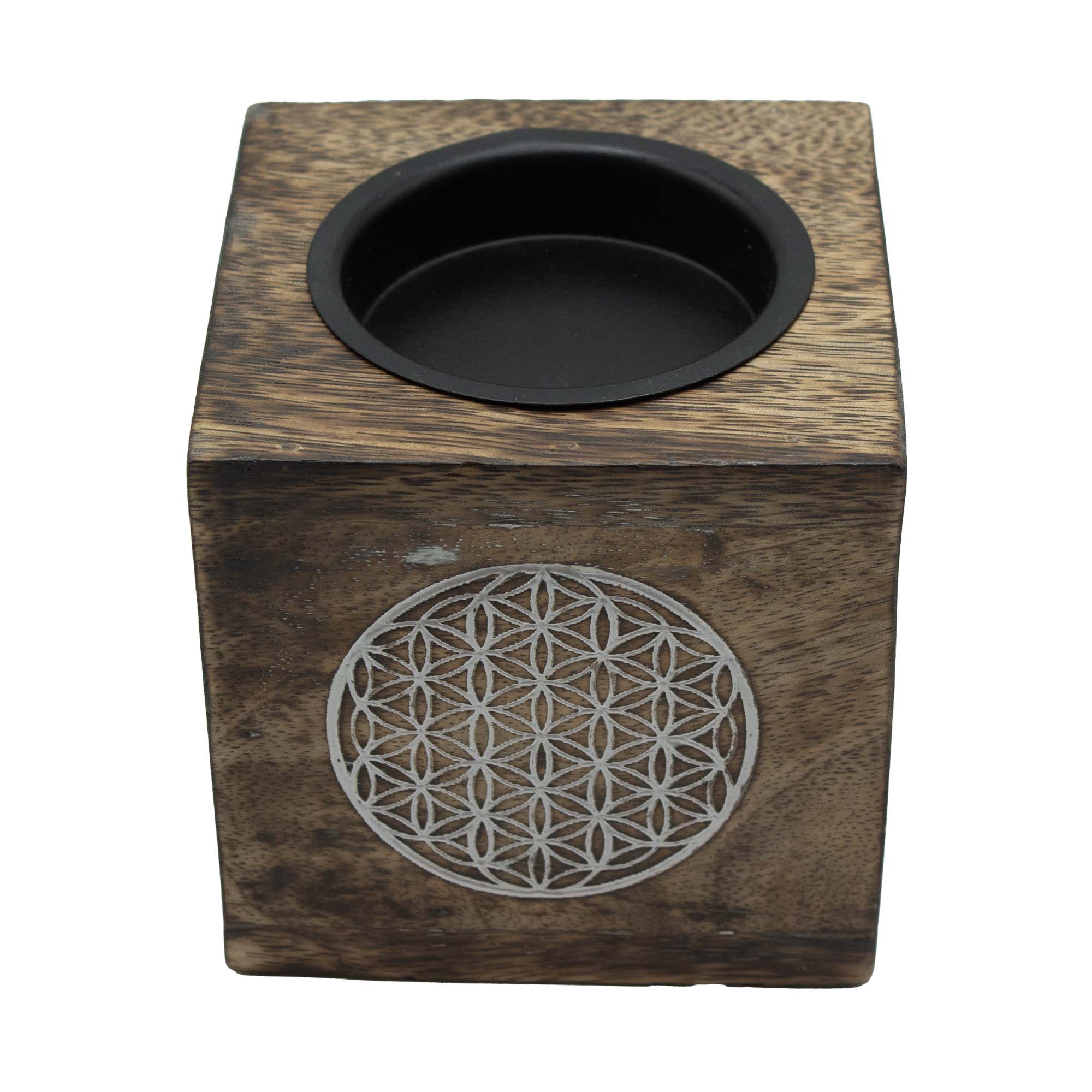 Featuring the Flower of Life pattern, this oil burner offers a more geometric and contemporary design while still carrying symbolic meaning linked to harmony and creation. Made from mango wood, it suits both modern and spiritual interiors.