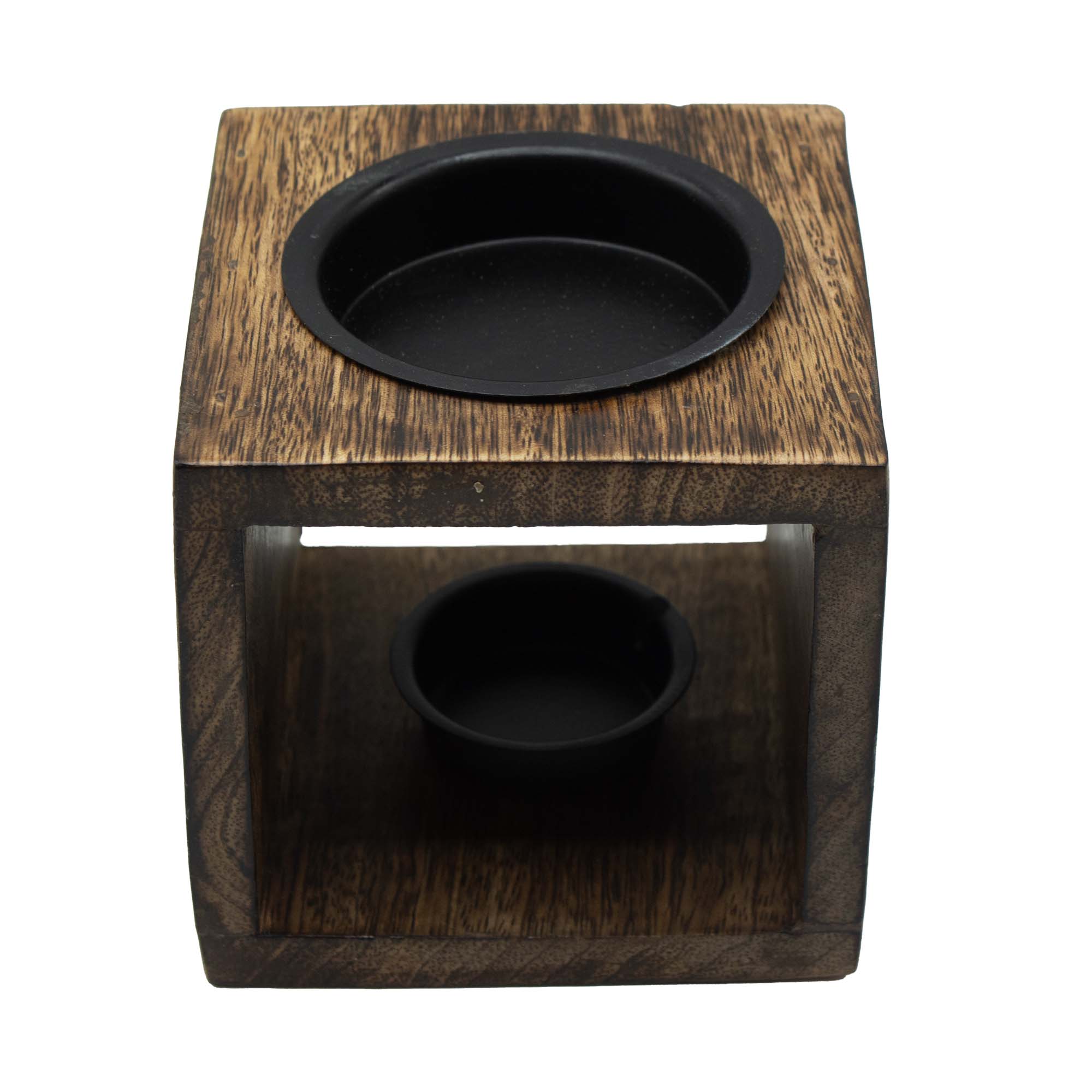 This square mango wood oil burner showcases an engraved Elephant motif, symbolising strength, wisdom and good fortune. Its compact size makes it easy to place on shelves, side tables or smaller spaces, while still offering full functionality.