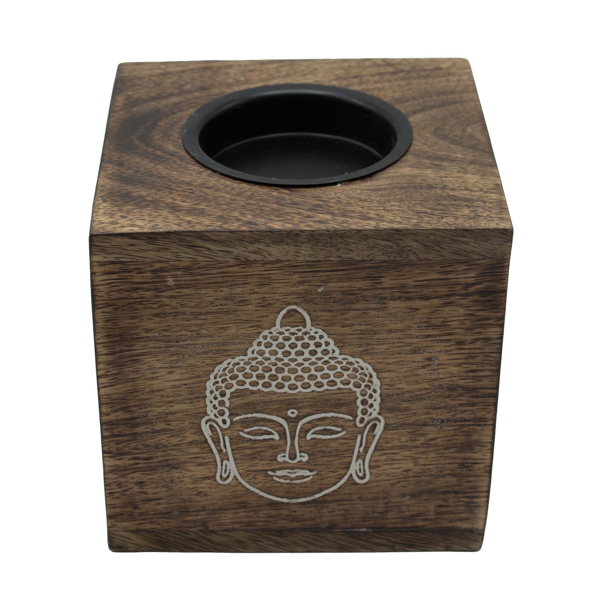 This oil burner features a carved Buddha face, offering a calm and serene decorative accent. Made from solid mango wood, the square shape provides a balanced, grounded look that fits easily into both modern and traditional interiors.