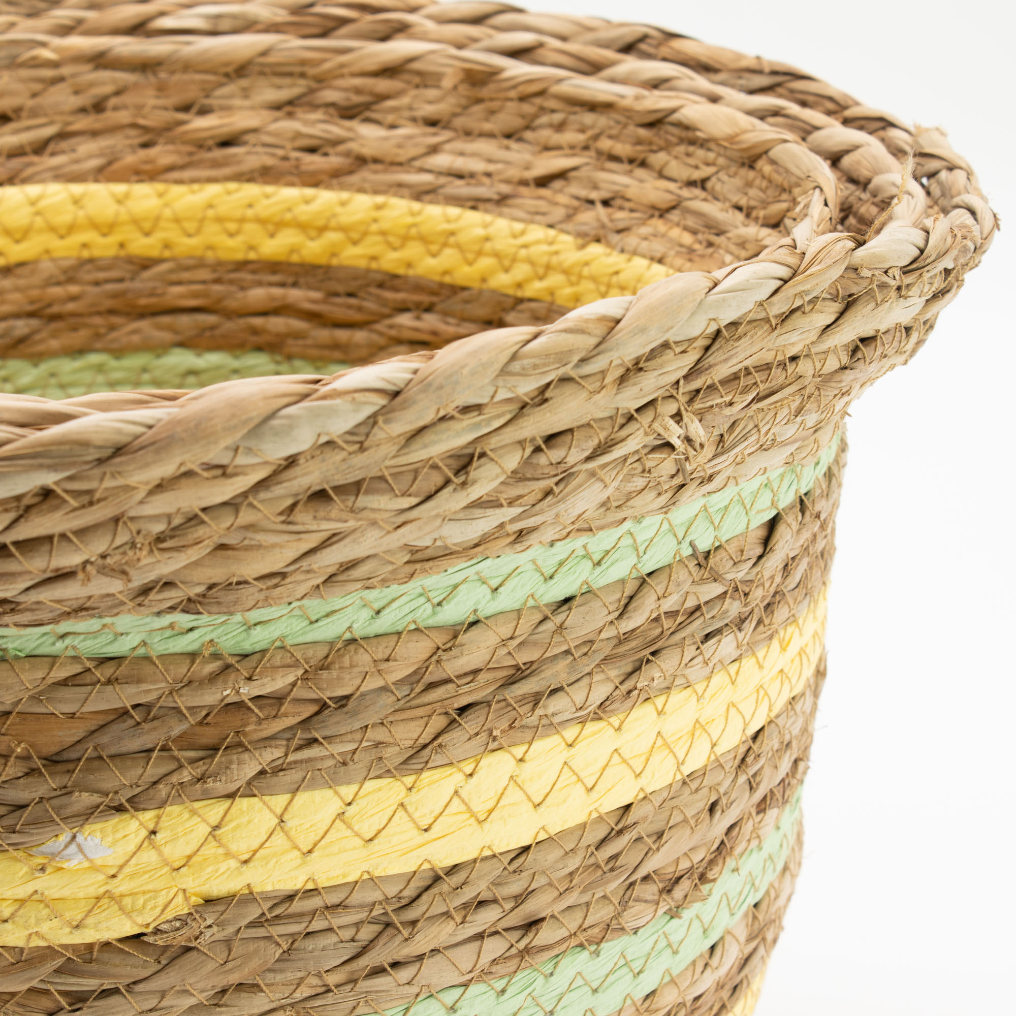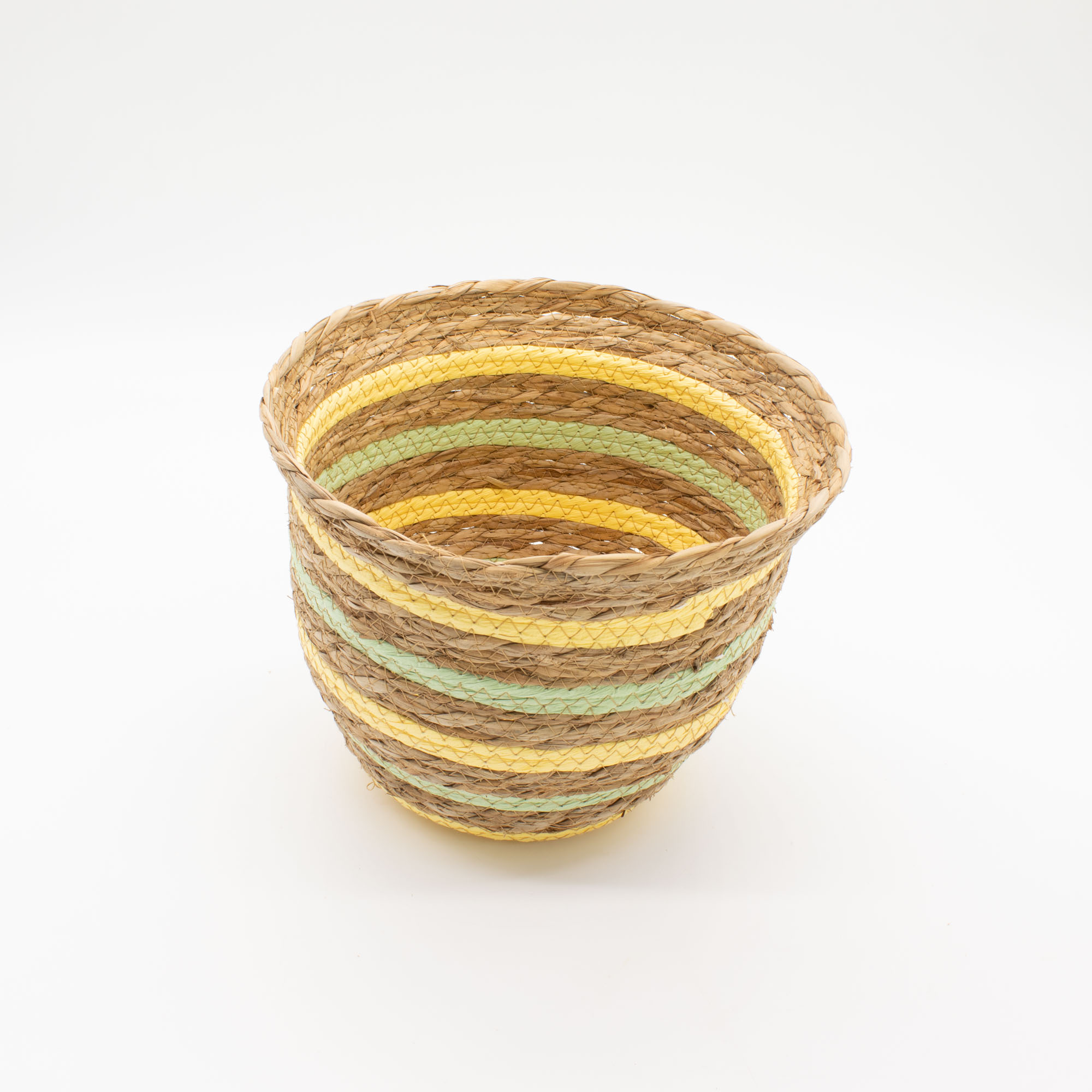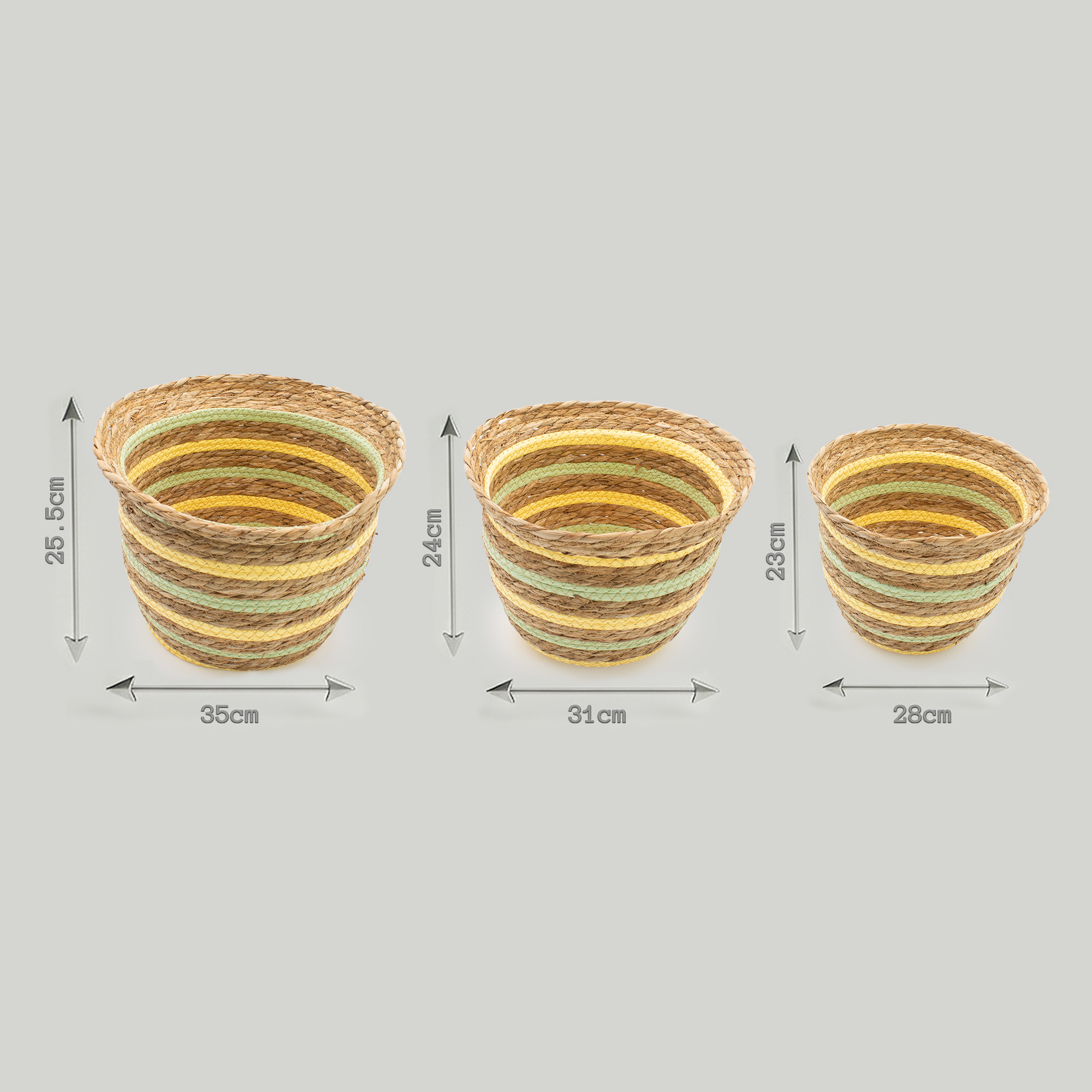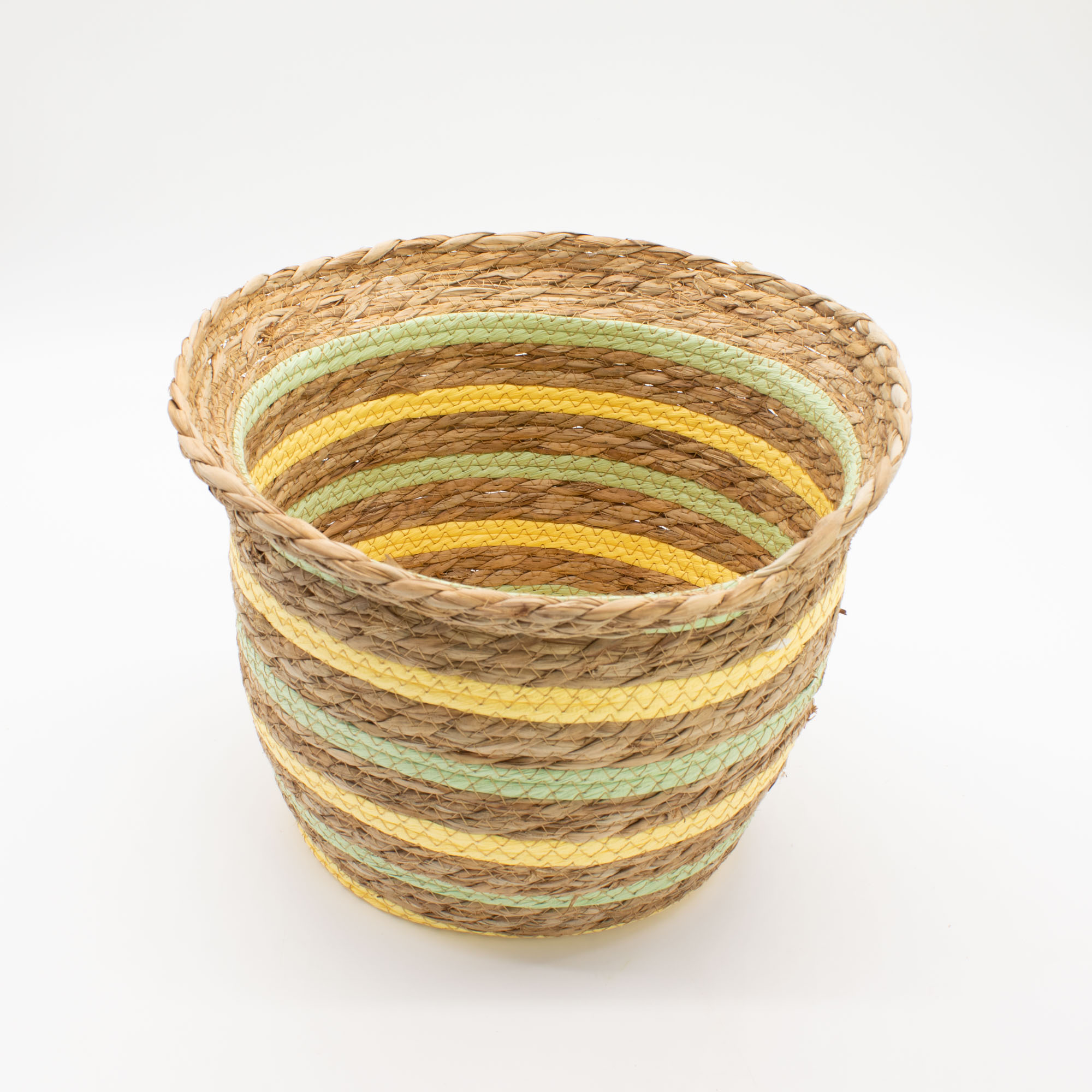 Seagrass & Straw Vase Shaped Baskets – Natural Yellow & Green are crafted from tightly woven seagrass and straw fibres using a traditional coiling technique, creating a strong yet lightweight structure. The gently rounded, vase-shaped silhouette is complemented by soft yellow and green stripe detailing, giving the baskets a warm, natural character while remaining versatile for storage. They are well suited to holding textiles, plant pots, accessories, or everyday household items.