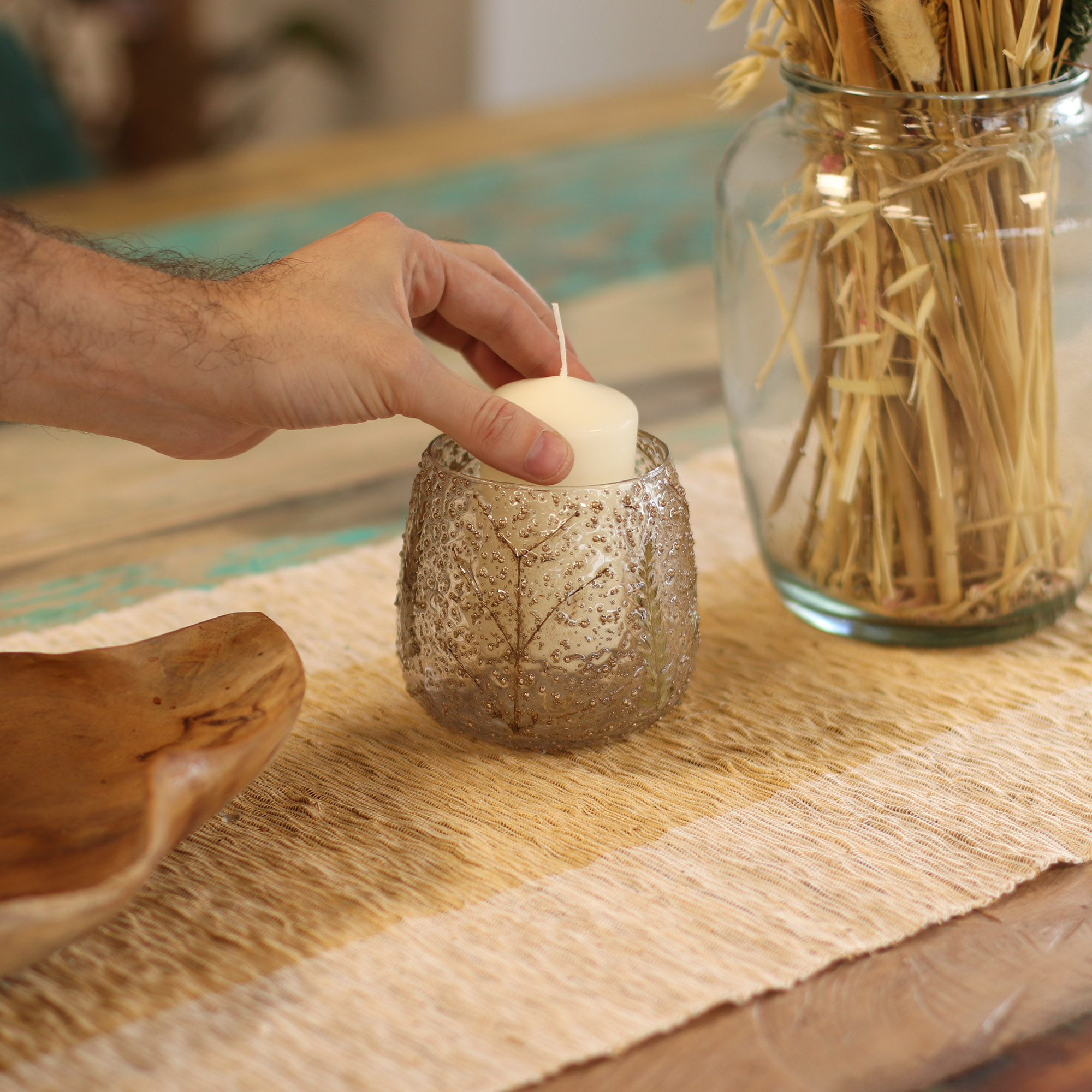 The Natural Floral Glass Straight Candle Holder – Pino showcases real pressed greenery within recycled glass, giving every piece its own soft, woodland character. The straight, modern profile pairs beautifully with the earthy Pino foliage, creating a calm, natural aesthetic.