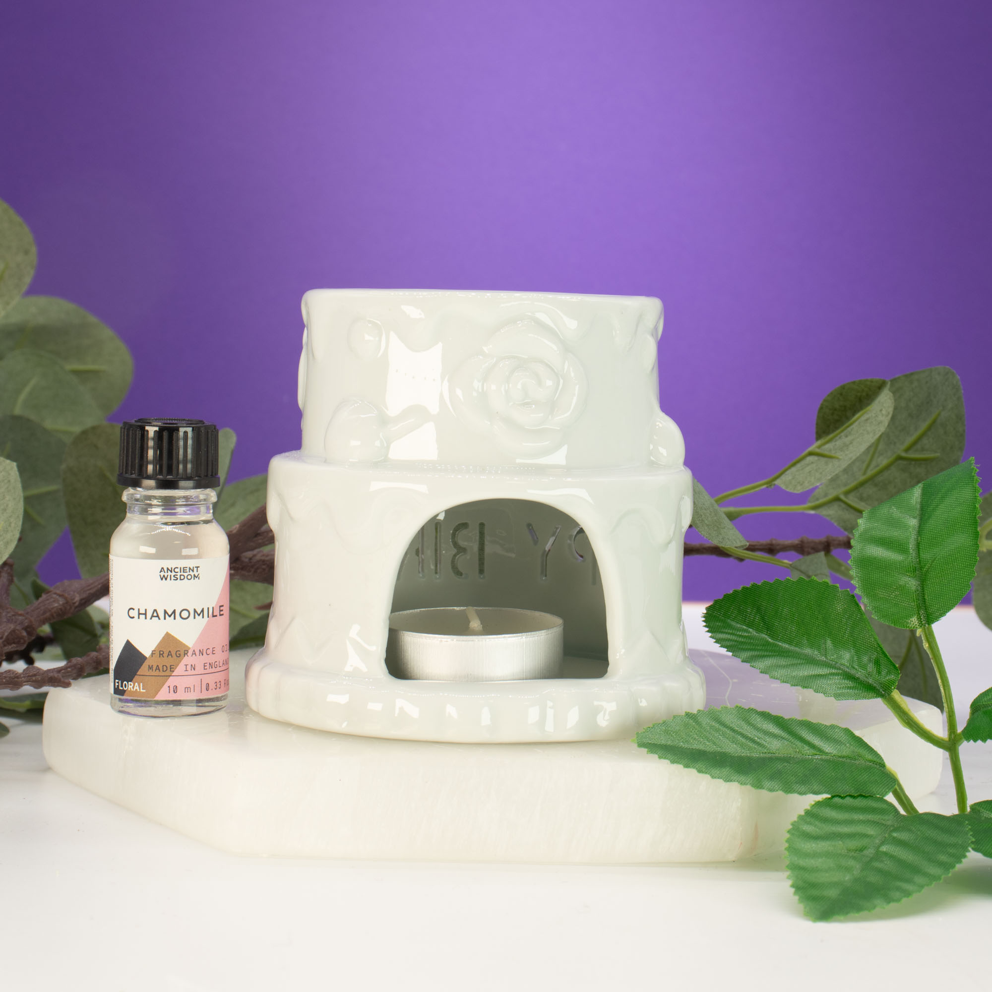 The Ceramic Cake Oil Burner – HAPPY BIRTHDAY – White is a celebration-driven piece designed to add a personalised touch to gifting and occasion-based retail ranges.