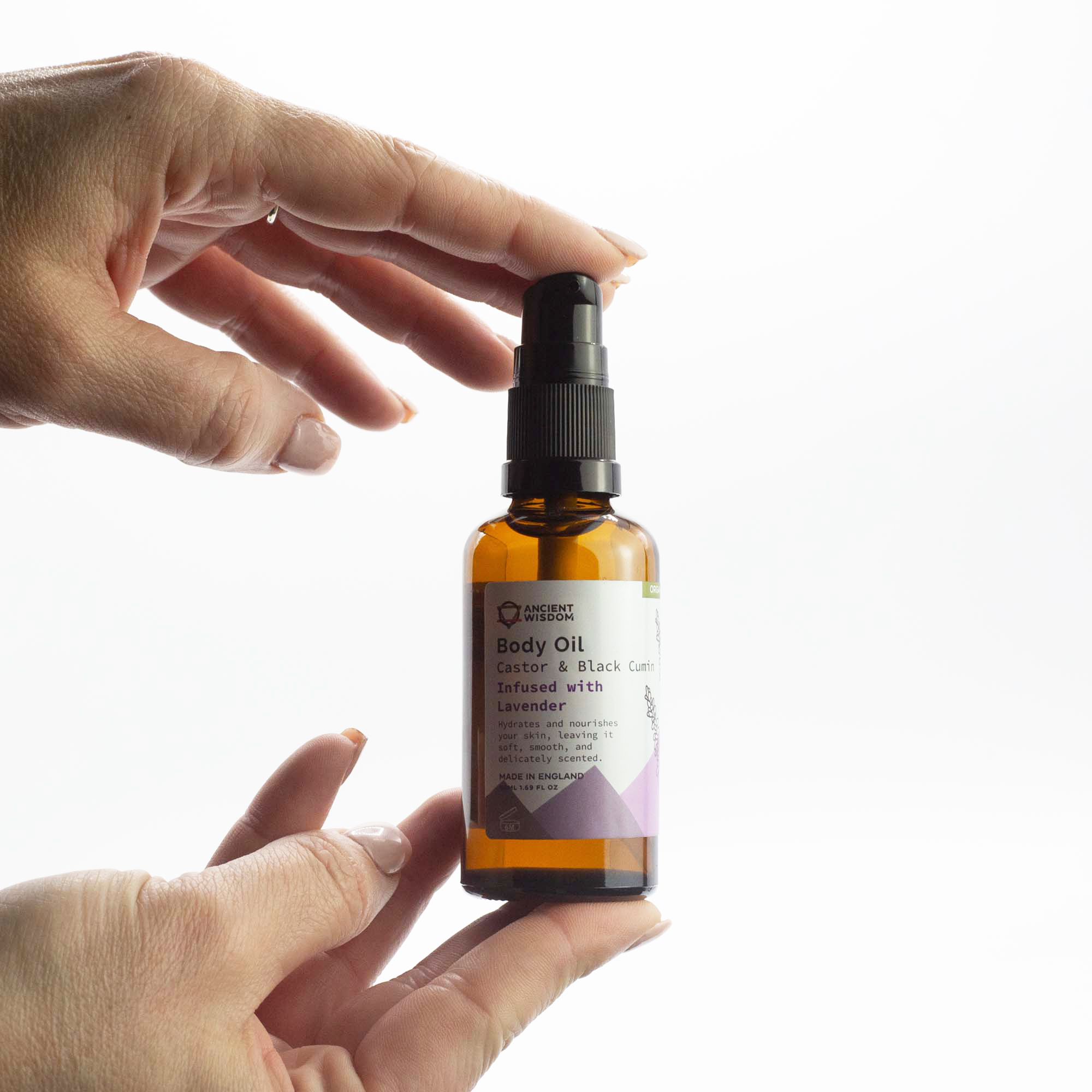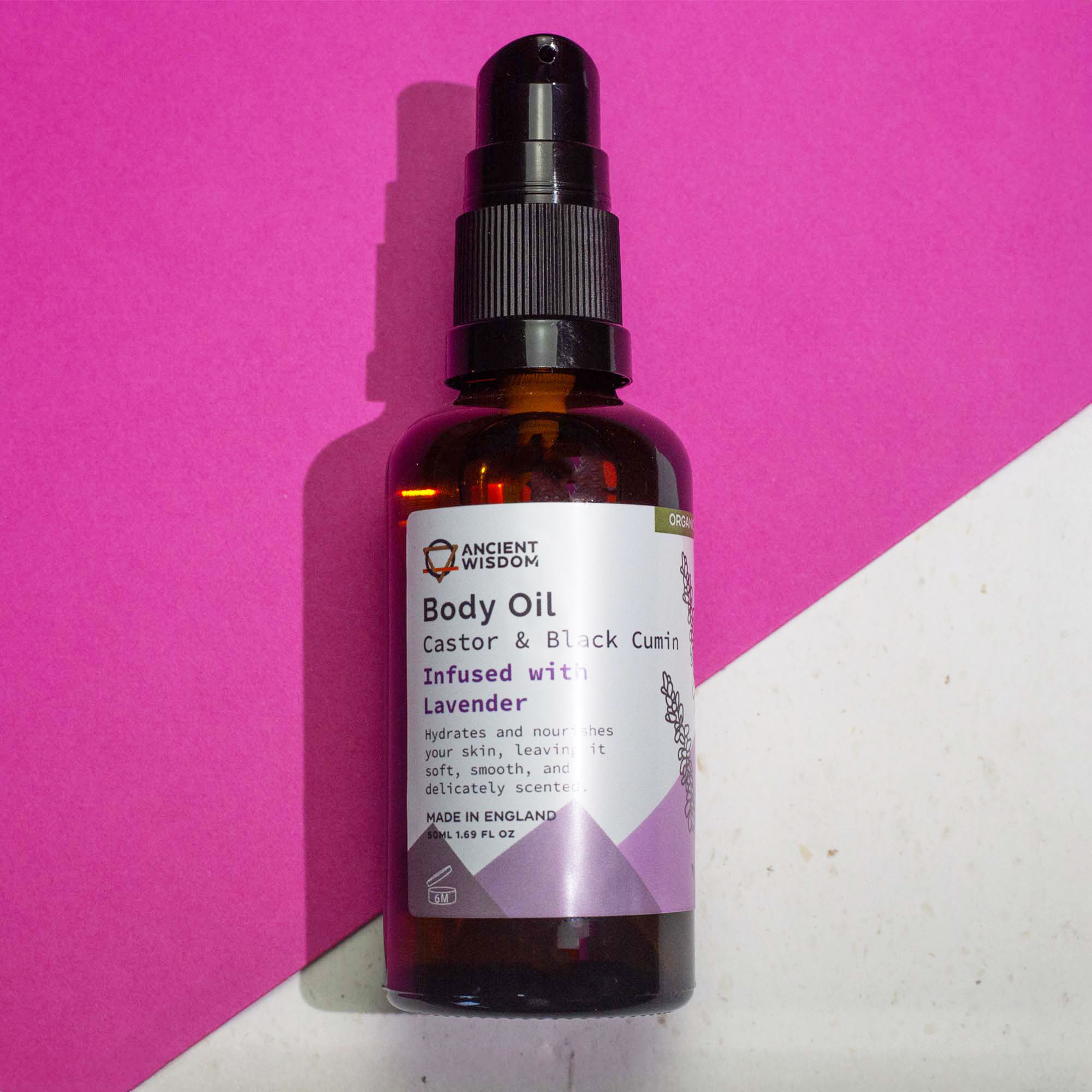 The body oil is crafted with a unique blend of organic Black Cumin Seed Oil (Nigella Sativa Seed Oil) and Castor Oil (Ricinus Communis Seed Oil), both known for their deep moisturizing and healing properties. The star ingredient is calming Lavender Essential Oil, offering a soothing and aromatic experience while enhancing the oil's skin-benefiting qualities. This variant is ideal for daily skincare routines, especially for relaxation and promoting a sense of well-being.