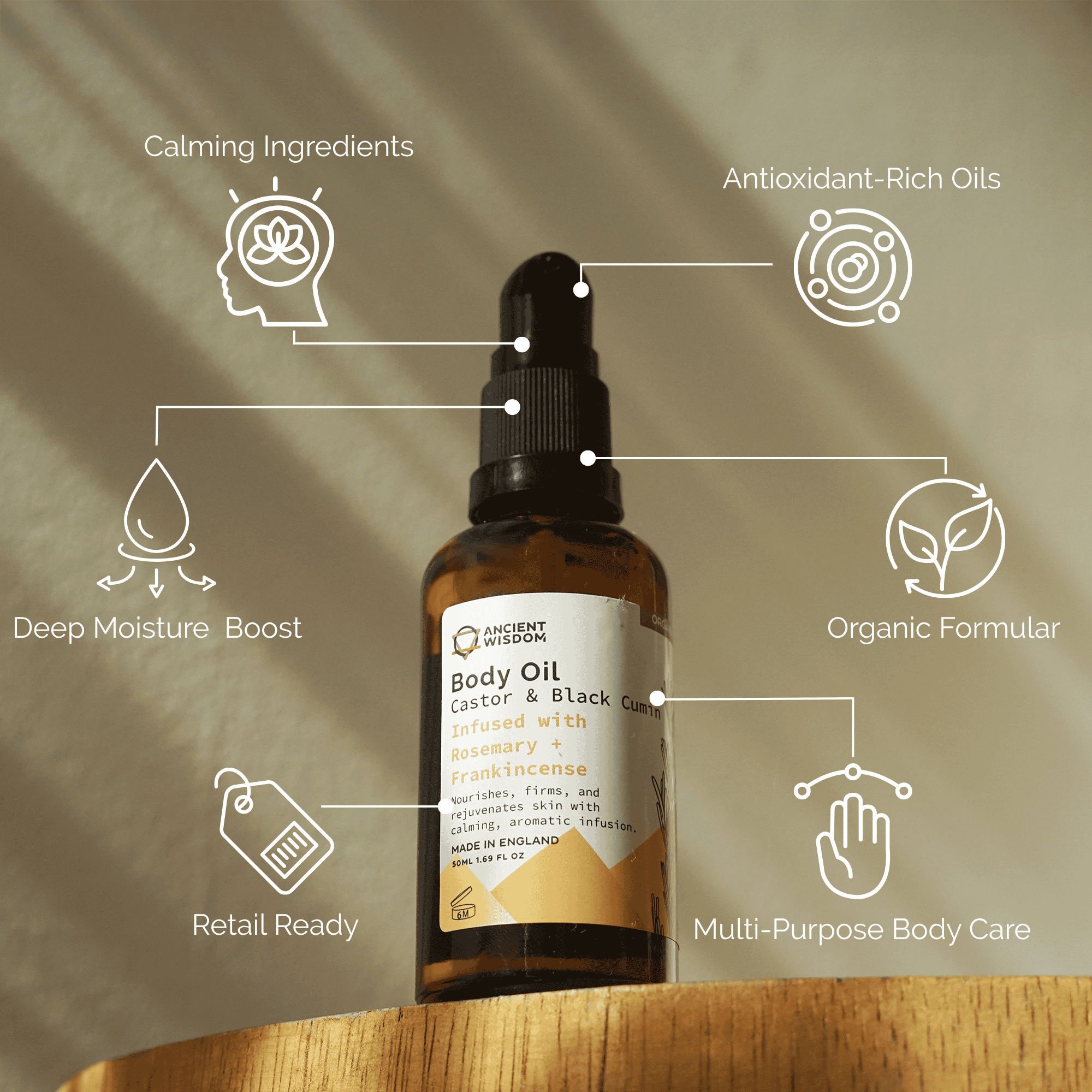 This new Organic Body Oil 50ml - Rosemary & Frankincense is a truly luxurious and nourishing solution, made to hydrate and rejuvenate your customers' skin. This pure, cruelty-free, and vegan-friendly oil comes in an elegant amber bottle, packed with 50ml of premium skincare.