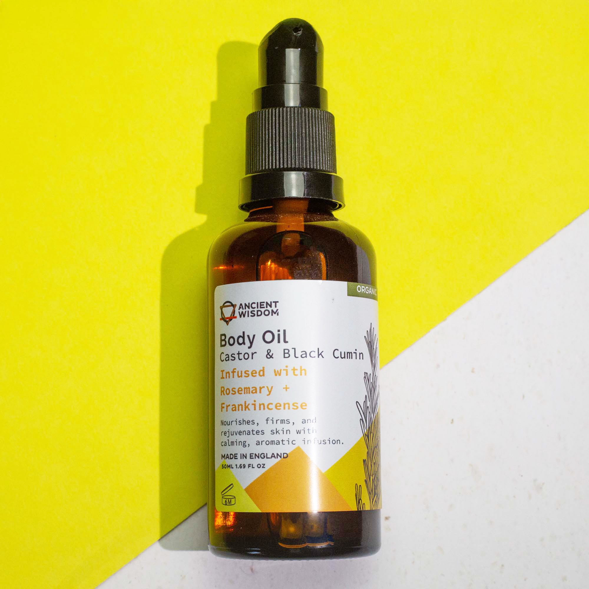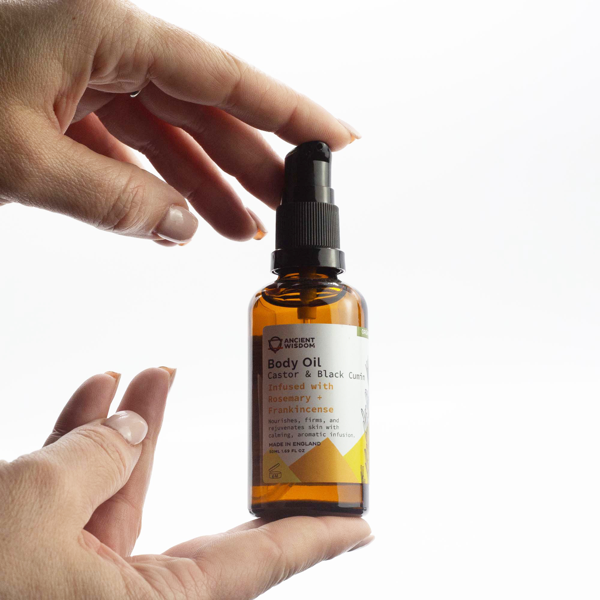 The body oil is crafted with a unique blend of organic Black Cumin Seed Oil (Nigella Sativa Seed Oil) and Castor Oil (Ricinus Communis Seed Oil), both known for their deep moisturizing and healing properties. The star ingredients are invigorating Rosemary Essential Oil and grounding Frankincense Essential Oil, offering a harmonious and aromatic experience while enhancing the oil's skin-benefiting qualities. This variant is ideal for daily skincare routines, especially for its clarifying and balancing properties, promoting a sense of renewal.