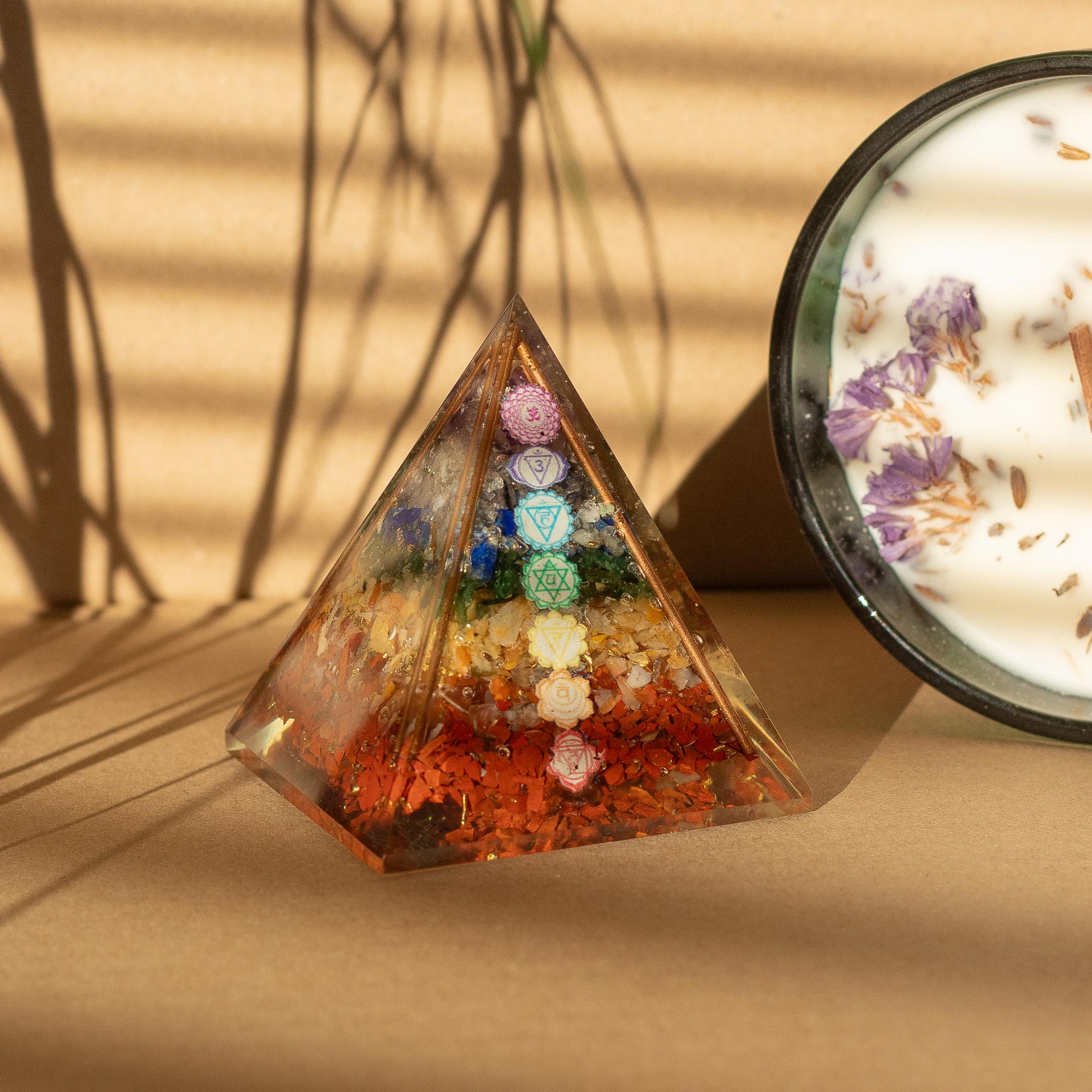 Add colour, harmony, and energy balance to your wellness collection with the Medium Orgonite Pyramid – Copper Bars with 7 Chakra Chips. Each pyramid is handcrafted from resin, metal shavings, and genuine gemstones, featuring copper bars that enhance energy flow and seven chakra crystal chips, each symbolising alignment, vitality, and inner peace.