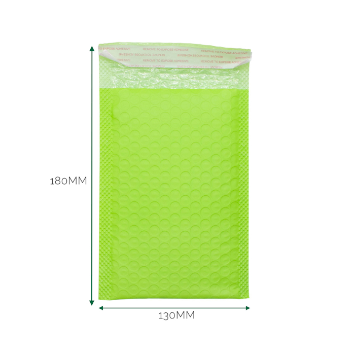 These 130 × 180 mm green poly bubble envelopes are built for compact shipments that benefit from high visibility and reliable protection. Their bright finish makes small parcels easy to spot while keeping the contents securely enclosed.