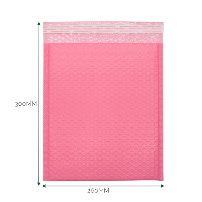 These 260 × 300 mm pink poly bubble envelopes are designed for larger orders that need both visual impact and dependable handling. Their wider profile comfortably accommodates apparel, boxed items, and bundled products without forcing contents or adding unnecessary weight.