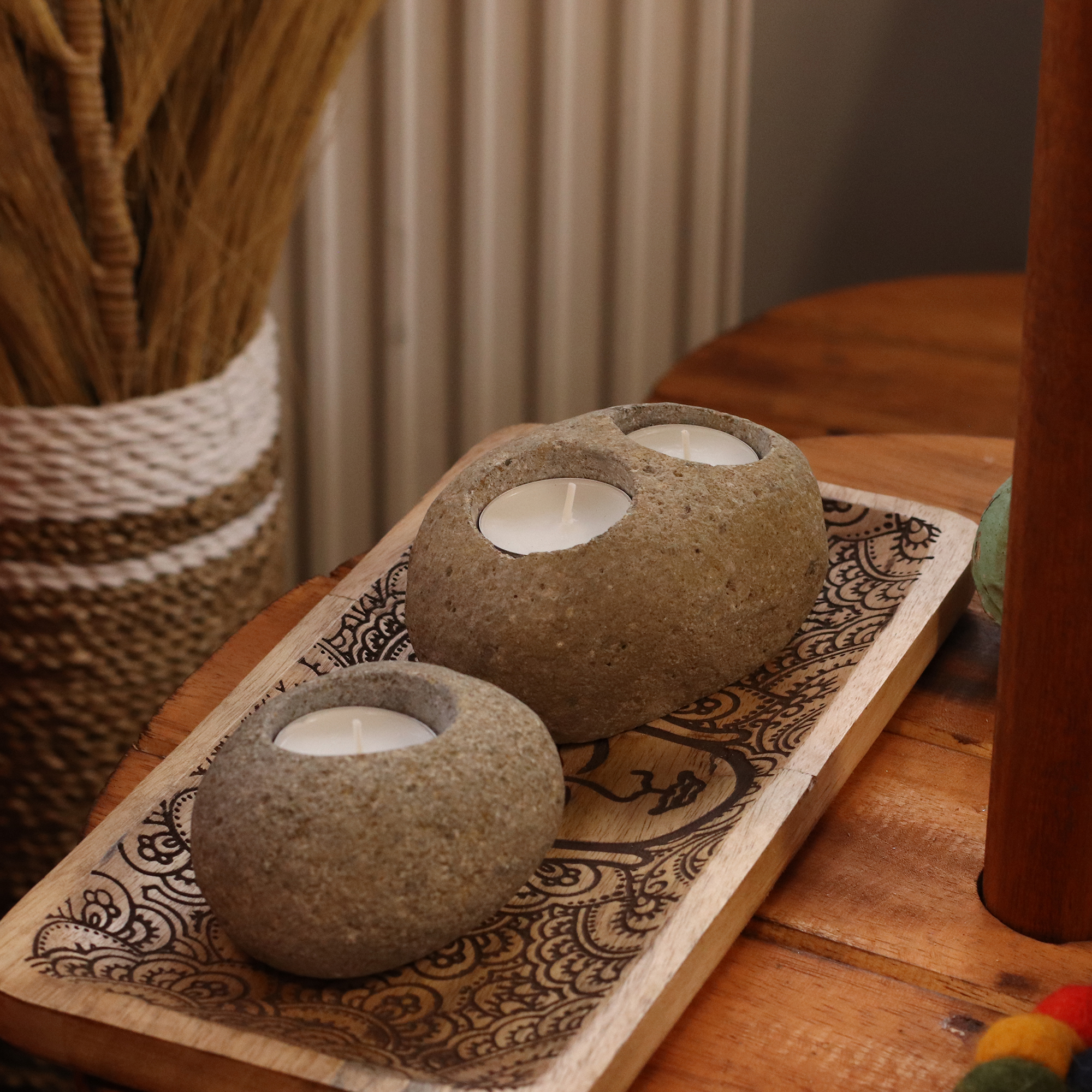 The organic texture, subtle colour variations, and rounded shape make every piece entirely unique. Designed for standard tea lights, it creates a calm, grounding glow that suits both rustic and modern interiors.