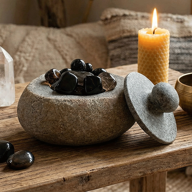 Some traditions suggest these stones can act as grounding vessels, helping to rebalance or steady gemstones and crystal jewellery placed inside. This belief is what inspired the name “Grounding Pots”. Even without a spiritual context, the solid feel and natural surface of the stone can offer a calming focal point during busy or stressful moments.