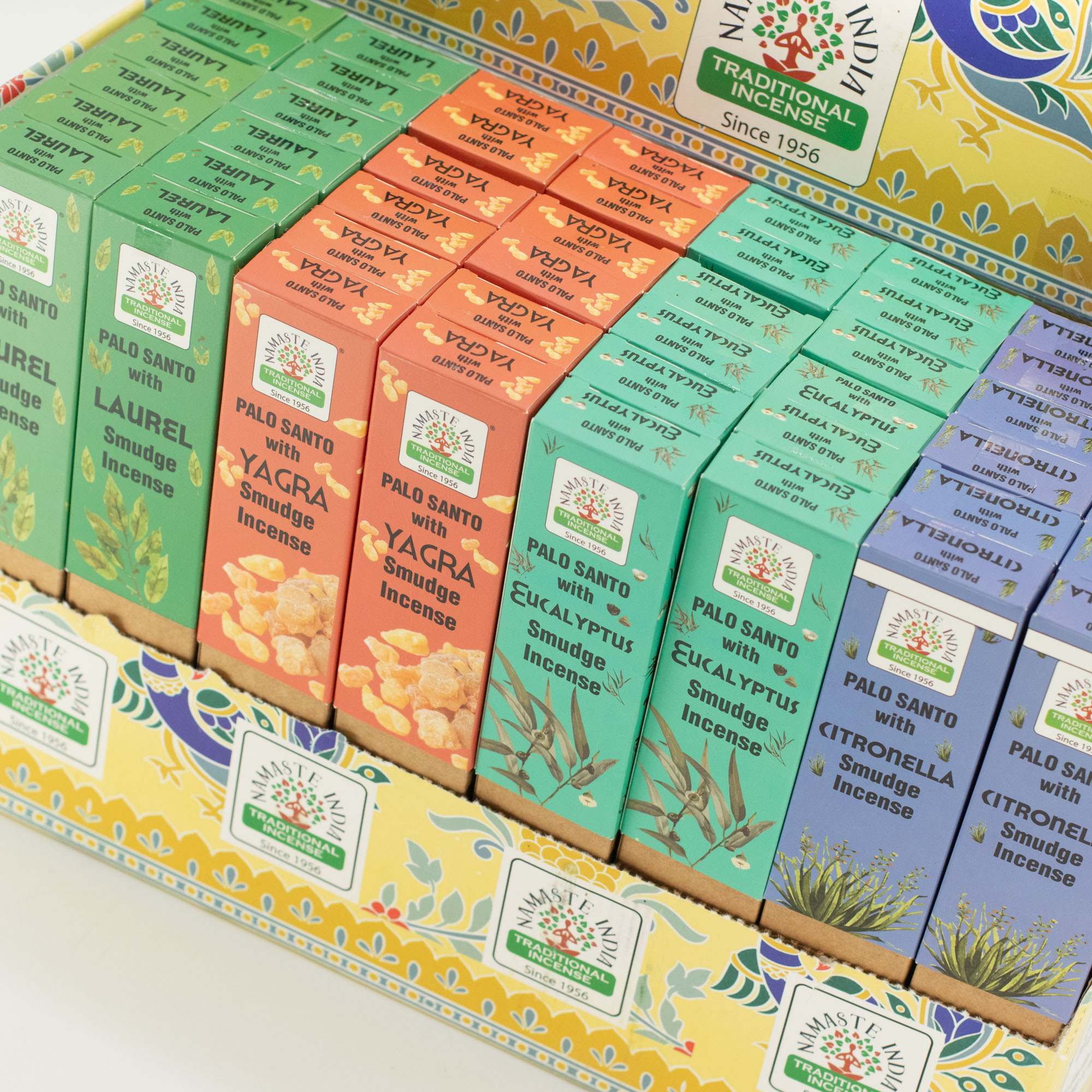 Strengthen your retail selection with the 48x Earth Inspired Smudge Incense Display Pack, a comprehensive solution for businesses looking to provide a diverse, high-quality range of traditional scents. This master display unit features an expert curation of four distinct fragrances—Laurel, Yagra, Eucalyptus, and Citronella—each paired with the grounding essence of Palo Santo to create a powerful sensory experience.