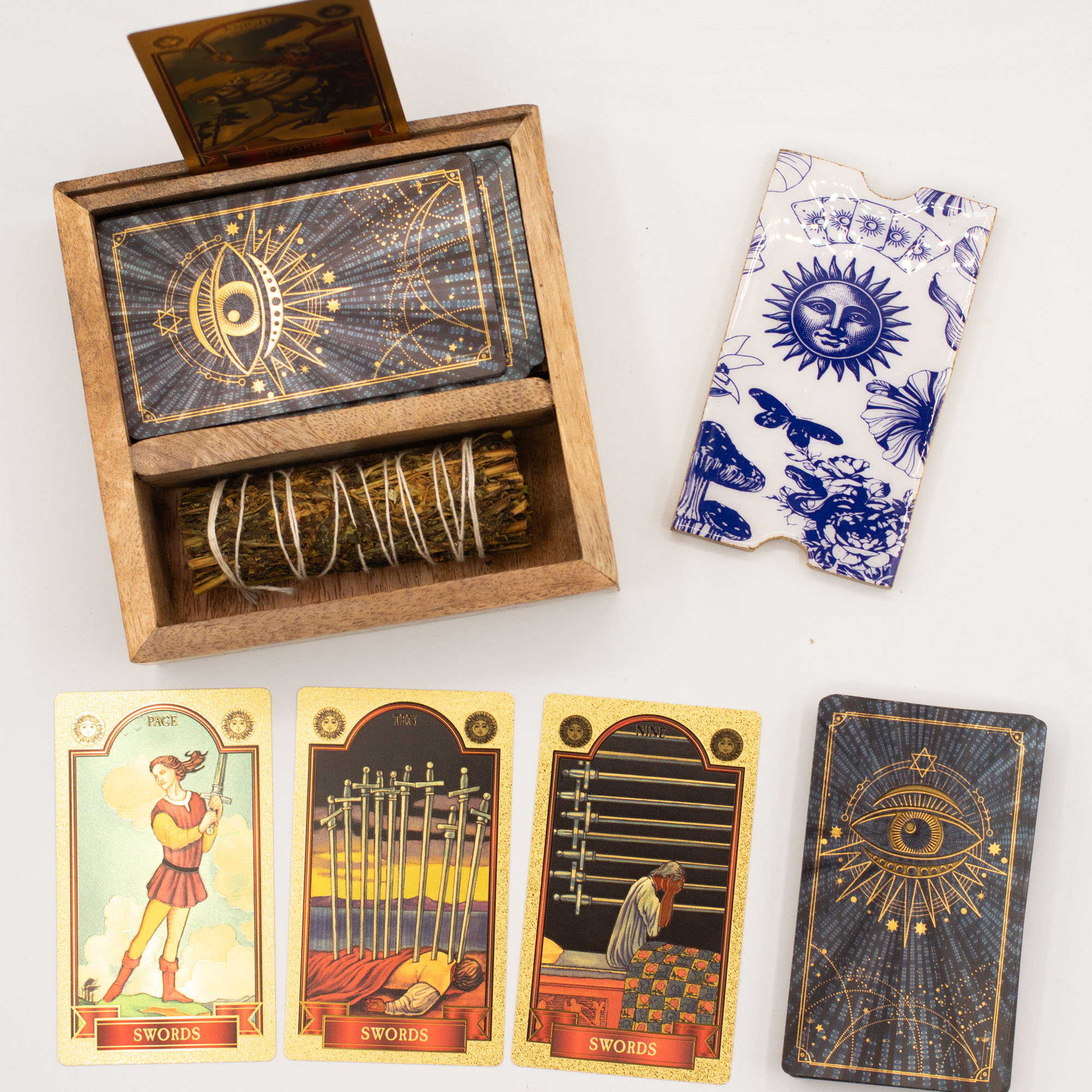 This mango wood tarot box is designed for readers who like a little more structure in their setup. The interior is divided into two sections, allowing cards to be stored separately while keeping everything organised and easy to reach. The front slot functions as a built-in card holder, making it simple to display a chosen card during readings or as part of a retail presentation.