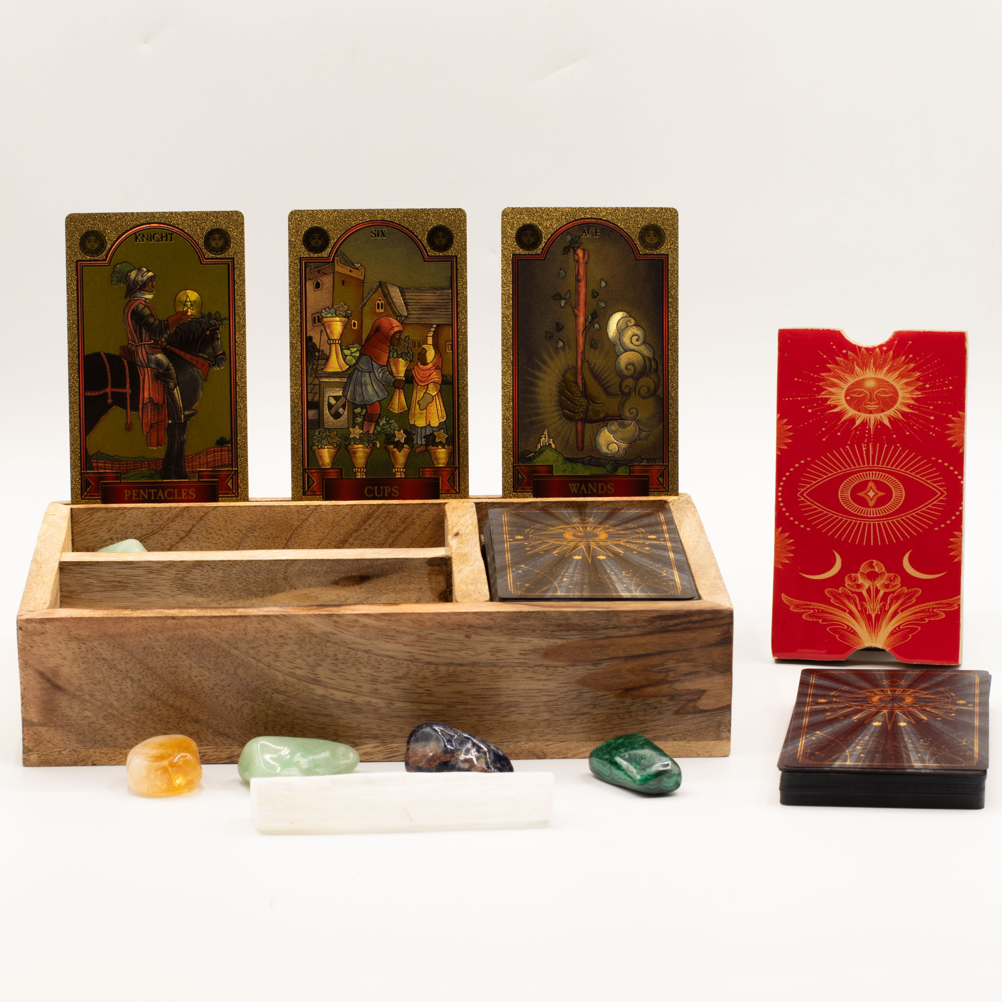 Designed for more expansive readings, this mango wood tarot box offers three internal sections to support a more layered approach to card storage and use. The divided layout allows decks, spreads or reference cards to be kept neatly organised, while the integrated front card holder provides a clear focal point for a chosen card during readings or in-store displays.