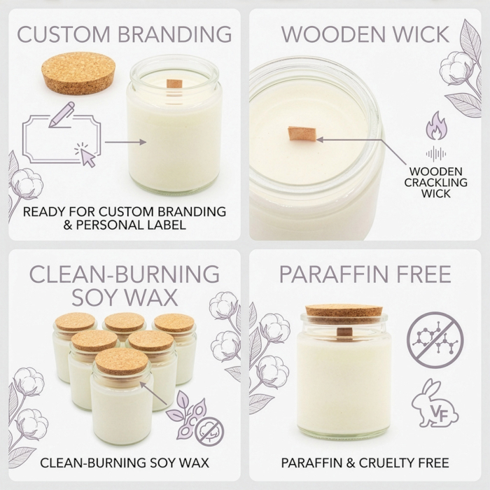 Add a fresh and clean fragrance to your home scent range with the Leaves and Linen Wood Wick Soy Candle. Developed for businesses building their own branded collections, this candle comes in an unlabelled, ready-to-customise format, offering a simple solution for retailers who want to introduce their own candle line. The combination of a clear glass jar and natural cork lid creates a neutral, modern look that blends easily with different brand styles.