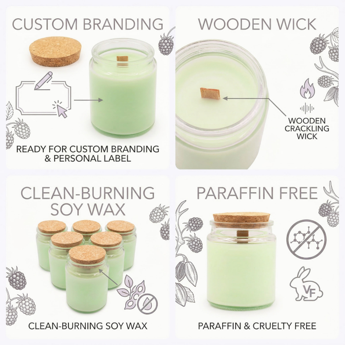 Introduce a fresh botanical fragrance to your home fragrance range with the Twilight Vine Wood Wick Soy Candle. Designed for retailers building their own branded candle collections, this candle comes in an unlabelled, ready-to-brand format, making it easy to personalise with your own labels and packaging. The clear glass jar paired with a natural cork lid provides a simple and modern presentation that suits a wide range of retail concepts.