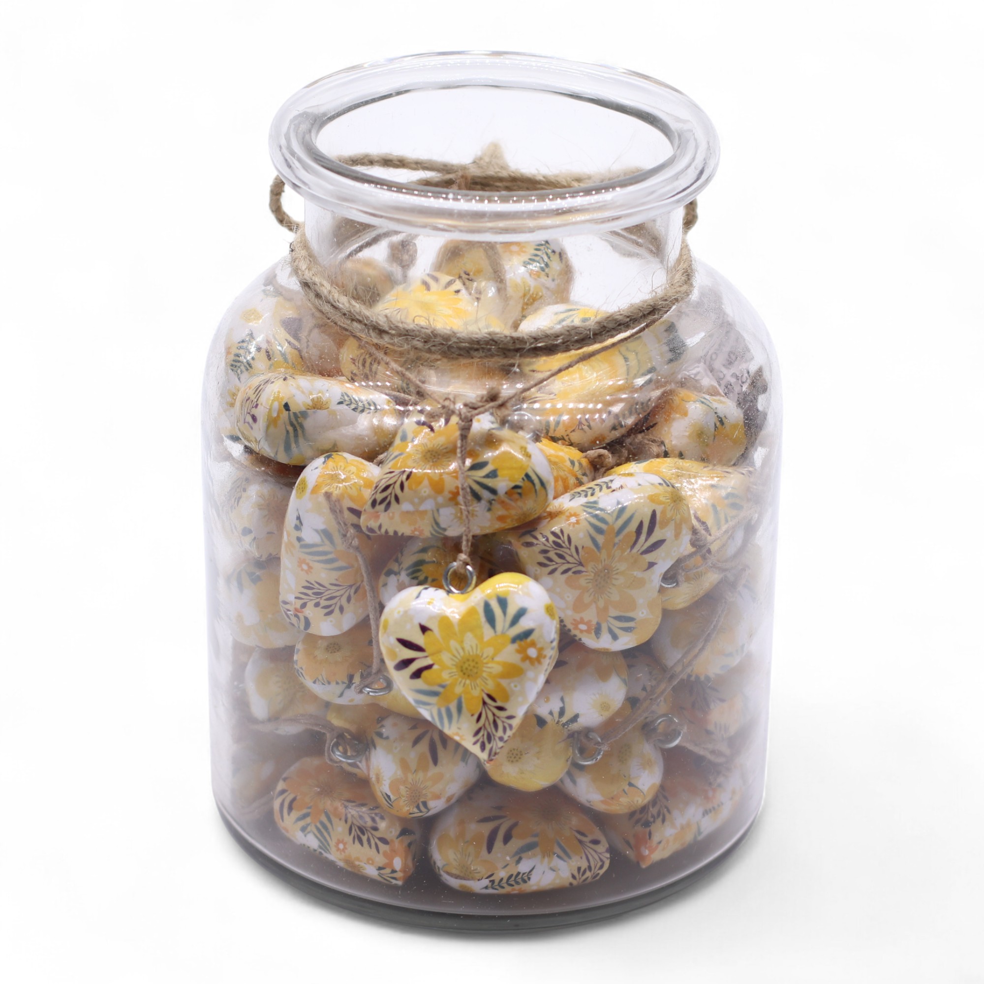 Lift your seasonal display with this cheerful jar approx. of 50 large Yellow Floral Decor Wood Hearts, each finished with a bright, vintage-inspired pattern. Their sunny look brings a warm touch to Christmas décor, thoughtful gifting, or adding a light, uplifting accent to any interior.