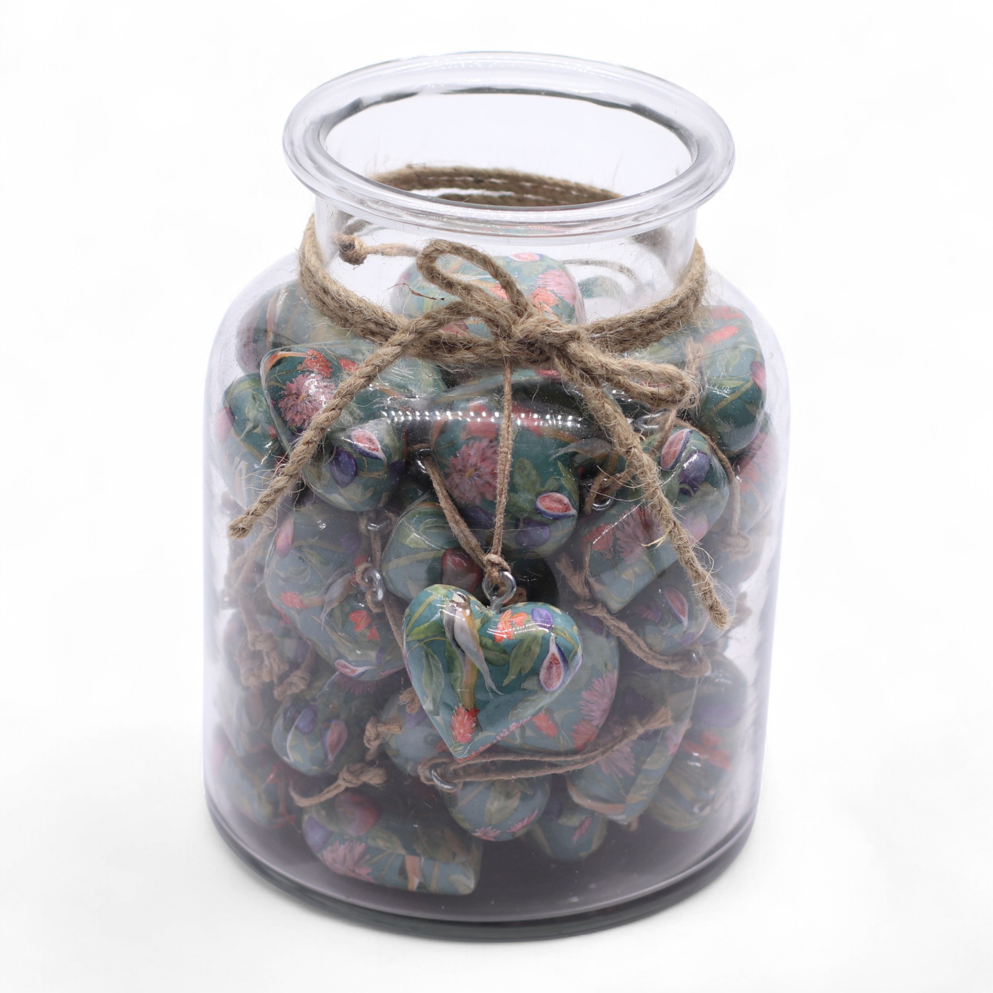 Enhance your seasonal range with this charming display jar holding approx. 50 large Bird & Floral Decor Wood Hearts. Each heart features a sweet bird-and-bloom design, adding a gentle, storybook-like touch to Christmas displays, heartfelt gifting, or uplifting home décor accents.